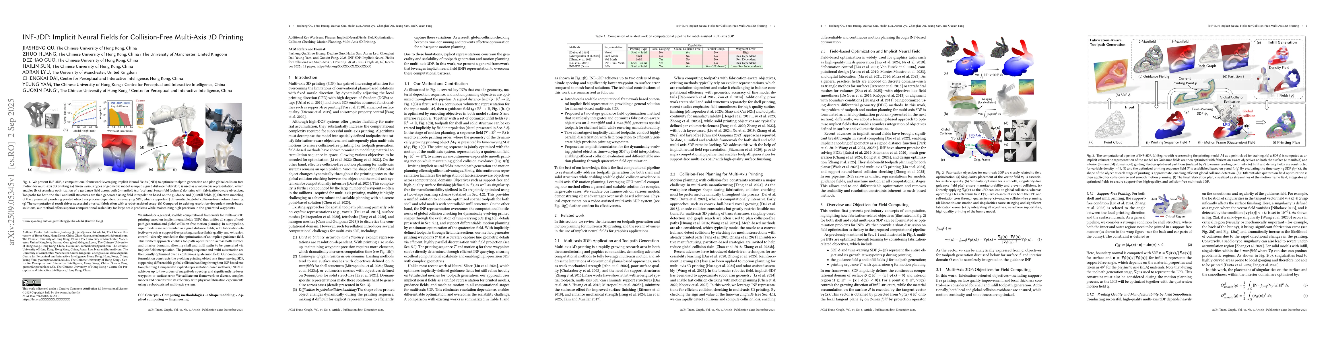 We introduce a general, scalable computational framework for multi-axis 3D printing based on implicit neural fields (INFs) that unifies all stages of toolpath generation and global collision-free motion planning. In our pipeline, input models are represented as signed distance fields, with fabrication objectives such as support-free printing, surface finish quality, and extrusion control being directly encoded in the optimization of an implicit guidance field. This unified approach enables toolpath optimization across both surface and interior domains, allowing shell and infill paths to be generated via implicit field interpolation. The printing sequence and multi-axis motion are then jointly optimized over a continuous quaternion field. Our continuous formulation constructs the evolving printing object as a time-varying SDF, supporting differentiable global collision handling throughout INF-based motion planning. Compared to explicit-representation-based methods, INF-3DP achieves up to two orders of magnitude speedup and significantly reduces waypoint-to-surface error. We validate our framework on diverse, complex models and demonstrate its efficiency with physical fabrication experiments using a robot-assisted multi-axis system.