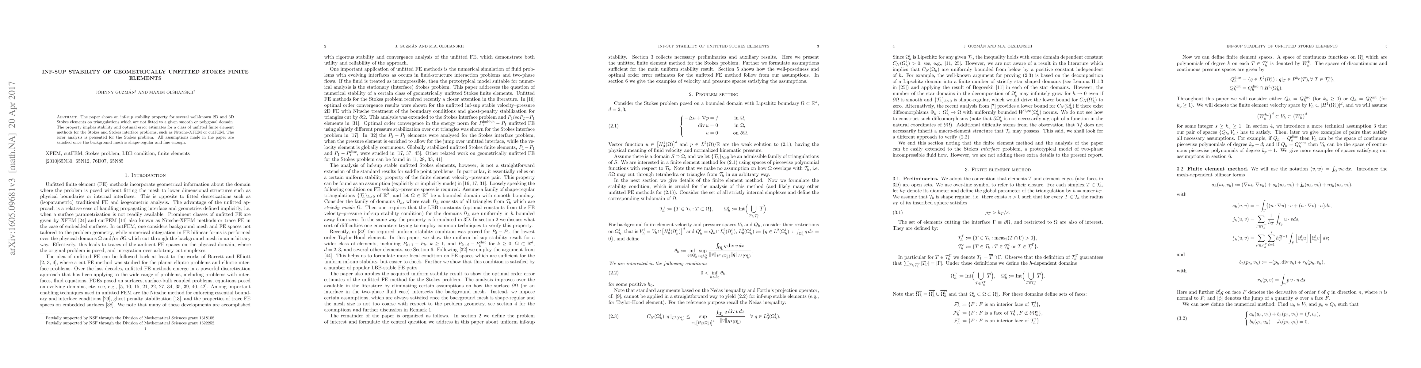 The paper shows an inf-sup stability property for several well-known 2D and 3D Stokes elements on triangulations which are not fitted to a given smooth or polygonal domain. The property implies stability and optimal error estimates for a class of unfitted finite element methods for the Stokes and Stokes interface problems, such as Nitsche-XFEM or cutFEM. The error analysis is presented for the Stokes problem. All assumptions made in the paper are satisfied once the background mesh is shape-regular and fine enough.