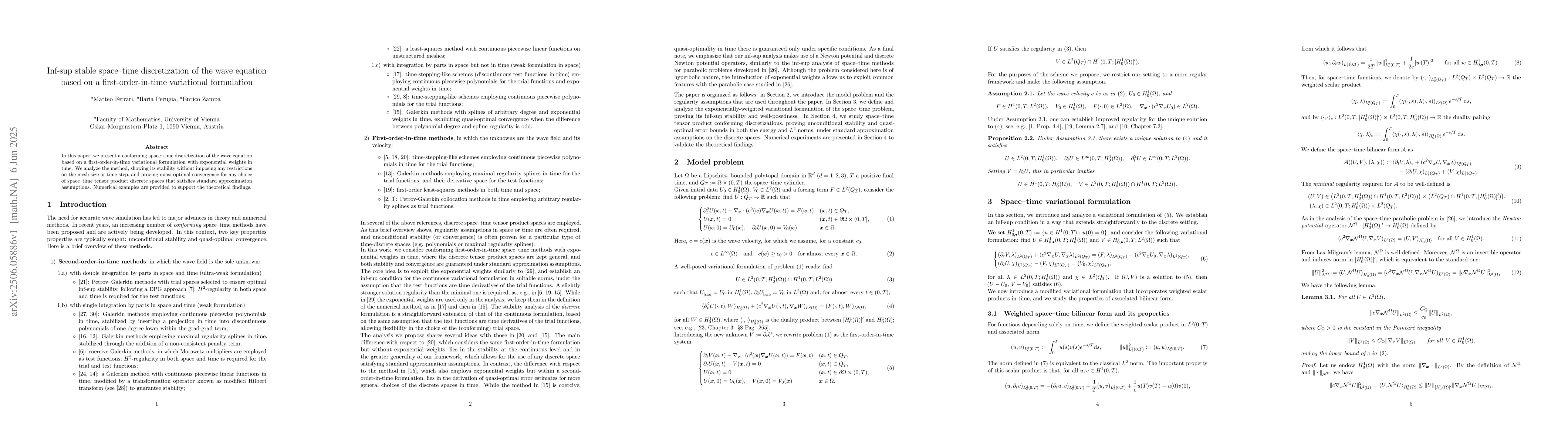 In this paper, we present a conforming space-time discretization of the wave equation based on a first-order-in-time variational formulation with exponential weights in time. We analyze the method, showing its stability without imposing any restrictions on the mesh size or time step, and proving quasi-optimal convergence for any choice of space-time tensor product discrete spaces that satisfies standard approximation assumptions. Numerical examples are provided to support the theoretical findings.
