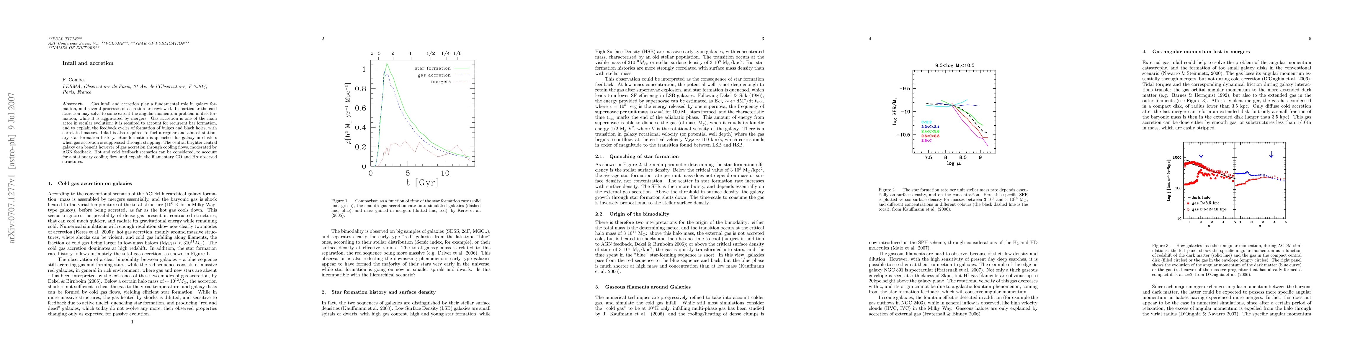 Gas infall and accretion play a fundamental role in galaxy formation, and several processes of accretion are reviewed. In particular the cold accretion may solve to some extent the angular momentum problem in disk formation, while it is aggravated by mergers. Gas accretion is one of the main actor in secular evolution: it is required to account for recurrent bar formation, and to explain the feedback cycles of formation of bulges and black holes, with correlated masses. Infall is also required to fuel a regular and almost stationary star formation history. Star formation is quenched for galaxy in clusters when gas accretion is suppressed through stripping. The central brighter central galaxy can benefit however of gas accretion through cooling flows, moderated by AGN feedback. Hot and cold feedback scenarios can be considered, to account for a stationary cooling flow, and explain the filamentary CO and Halpha observed structures.