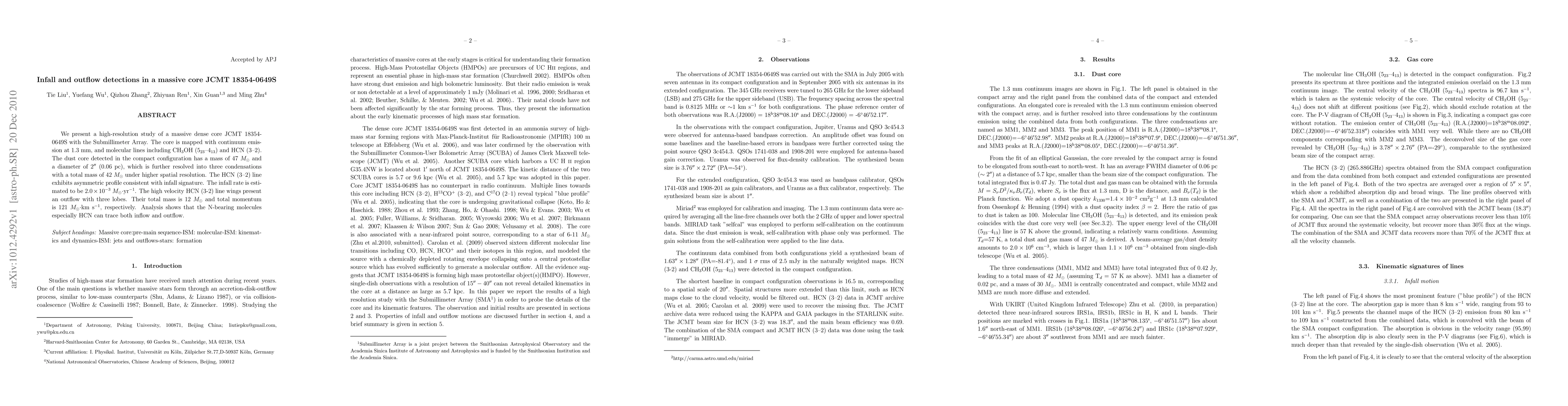This study uses the Submillimeter Array to investigate the massive dense core JCMT 18354-0649S, revealing infall and outflow signatures through CH$_{3}$OH and HCN line observations. The core shows an infall rate of $2.0\times10^{-3} M_{\odot}\cdot$yr$^{-1}$ and an outflow with a total mass of $12 M_{\odot}$.