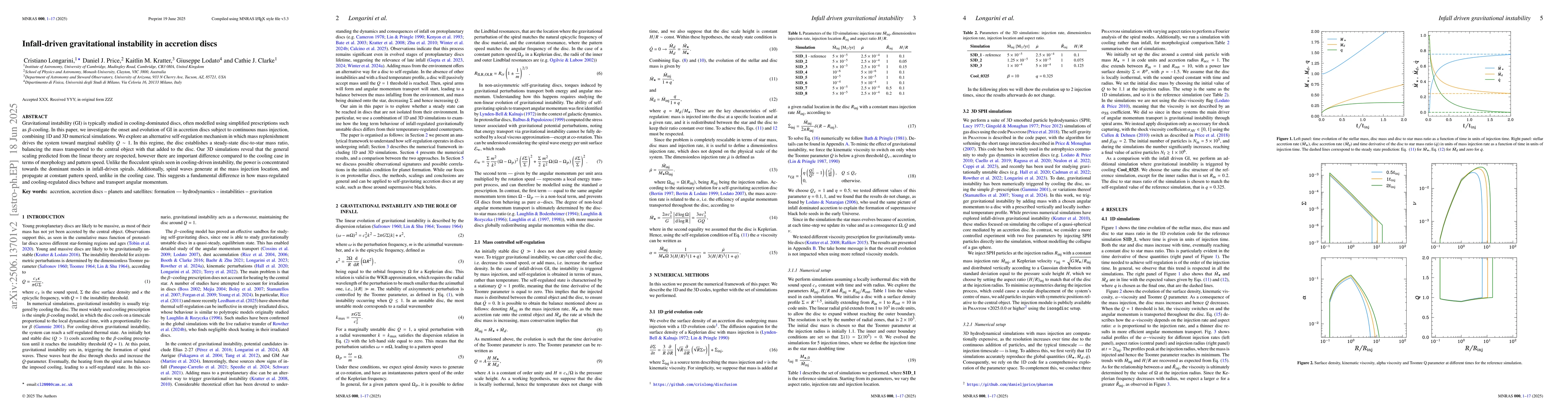 Gravitational instability (GI) is typically studied in cooling-dominated discs, often modelled using simplified prescriptions such as $\beta$-cooling. In this paper, we investigate the onset and evolution of GI in accretion discs subject to continuous mass injection, combining 1D and 3D numerical simulations. We explore an alternative self-regulation mechanism in which mass replenishment drives the system toward marginal stability $Q\sim 1$. In this regime, the disc establishes a steady-state disc-to-star mass ratio, balancing the mass transported to the central object with that added to the disc. Our 3D simulations reveal that the general scaling predicted from the linear theory are respected, however there are important difference compared to the cooling case in terms of morphology and pattern speed. Unlike the flocculent spirals seen in cooling-driven instability, the power is concentrated towards the dominant modes in infall-driven spirals. Additionally, spiral waves generate at the mass injection location, and propagate at constant pattern speed, unlike in the cooling case. This suggests a fundamental difference in how mass-regulated and cooling-regulated discs behave and transport angular momentum.