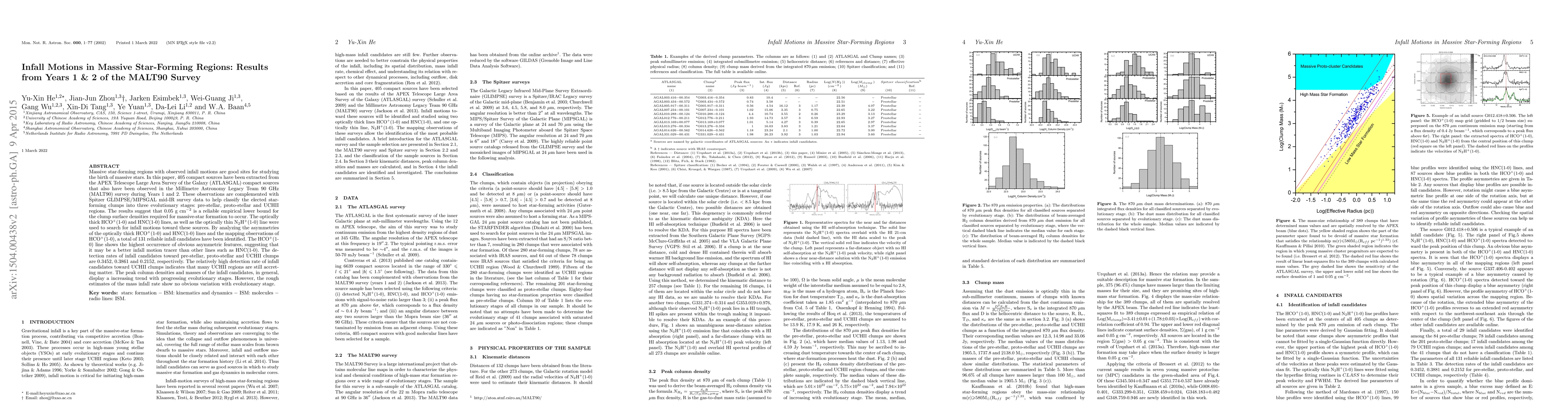 Massive star-forming regions with observed infall motions are good sites for studying the birth of massive stars. In this paper, 405 compact sources have been extracted from the APEX Telescope Large Area Survey of the Galaxy (ATLASGAL) compact sources that also have been observed in the Millimetre Astronomy Legacy Team 90 GHz (MALT90) survey during Years 1 and 2. These observations are complemented with Spitzer GLIMPSE/MIPSGAL mid-IR survey data to help classify the elected star-forming clumps into three evolutionary stages: pre-stellar, proto-stellar and UCHII regions. The results suggest that 0.05 g cm$^{-2}$ is a reliable empirical lower bound for the clump surface densities required for massive-star formation to occur. The optically thick HCO$^{+}$(1-0) and HNC(1-0) lines, as well as the optically thin N$_{2}$H$^{+}$(1-0) line were used to search for infall motions toward these sources. By analyzing the asymmetries of the optically thick HCO$^{+}$(1-0) and HNC(1-0) lines and the mapping observations of HCO$^{+}$(1-0), a total of 131 reliable infall candidates have been identified. The HCO$^{+}$(1-0) line shows the highest occurrence of obvious asymmetric features, suggesting that it may be a better infall motion tracer than other lines such as HNC(1-0). The detection rates of infall candidates toward pre-stellar, proto-stellar and UCHII clumps are 0.3452, 0.3861 and 0.2152, respectively. The relatively high detection rate of infall candidates toward UCHII clumps indicates that many UCHII regions are still accreting matter. The peak column densities and masses of the infall candidates, in general, display a increasing trend with progressing evolutionary stages. However, the rough estimates of the mass infall rate show no obvious variation with evolutionary stage.