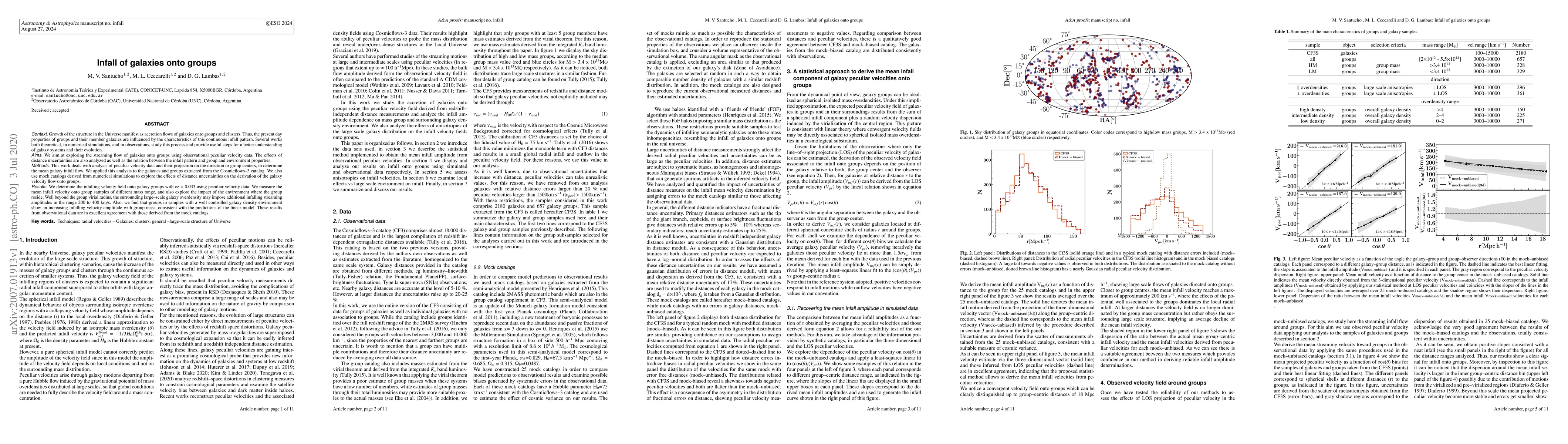 Growth of the structure in the Universe manifest as accretion flows of galaxies onto groups and clusters. Thus, the present day properties of groups and their member galaxies are influenced by the characteristics of this continuous infall pattern. Several works both theoretical, in numerical simulations, and in observations, study this process and provide useful steps for a better understanding of galaxy systems and their evolution. We aim at exploring the streaming flow of galaxies onto groups using observational peculiar velocity data. The effects of distance uncertainties are also analyzed as well as the relation between the infall pattern and group and environment properties.This work deals with analysis of peculiar velocity data and their projection on the direction to group centers, to determine the mean galaxy infall flow. We applied this analysis to the galaxies and groups extracted from the Cosmicflows-3 catalog. We also use mock catalogs derived from numerical simulations to explore the effects of distance uncertainties on the derivation of the galaxy velocity flow onto groups. We determine the infalling velocity field onto galaxy groups with cz < 0.033 using peculiar velocity data. We measure the mean infall velocity onto group samples of different mass range, and also explore the impact of the environment where the group reside. Well beyond the group virial radius, the surrounding large-scale galaxy overdensity may impose additional infalling streaming amplitudes in the range 200 to 400 km s$^{-1}$. Also, we find that groups in samples with a well controlled galaxy density environment show an increasing infalling velocity amplitude with group mass, consistent with the predictions of the linear model. These results from observational data are in excellent agreement with those derived from the mock catalogs.