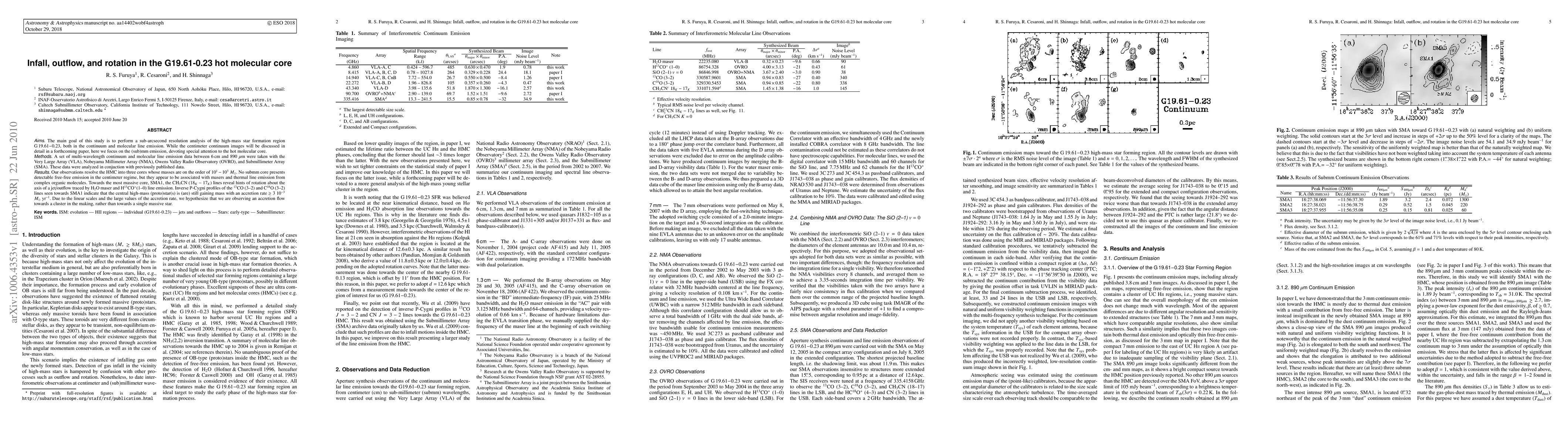Aims: The main goal of this study is to perform a sub-arcsecond resolution analysis of the high-mass star formation region G19.61-0.23, both in the continuum and molecular line emission. While the centimeter continuum images will be discussed in detail in a forthcoming paper, here we focus on the (sub)mm emission, devoting special attention to the hot molecular core. Results: Our observations resolve the HMC into three cores whose masses are on the order of 10^1-10^3 Msun. No submm core presents detectable free-free emission in the centimeter regime, but they appear to be associated with masers and thermal line emission from complex organic molecules. Towards the most massive core, SMA1, the CH3CN (18_K-17_K) lines reveal hints of rotation about the axis of a jet/outflow traced by H2O maser and H13CO+ (1--0) line emission. Inverse P-Cygni profiles of the 13CO (3--2) and C18O (3--2) lines seen towards SMA1 indicate that the central high-mass (proto)star(s) is (are) still gaining mass with an accretion rate $ge 3 ~10^{-3}$ Msun/yr. Due to the linear scales and the large values of the accretion rate, we hypothesize that we are observing an accretion flow towards a cluster in the making, rather than towards a single massive star.