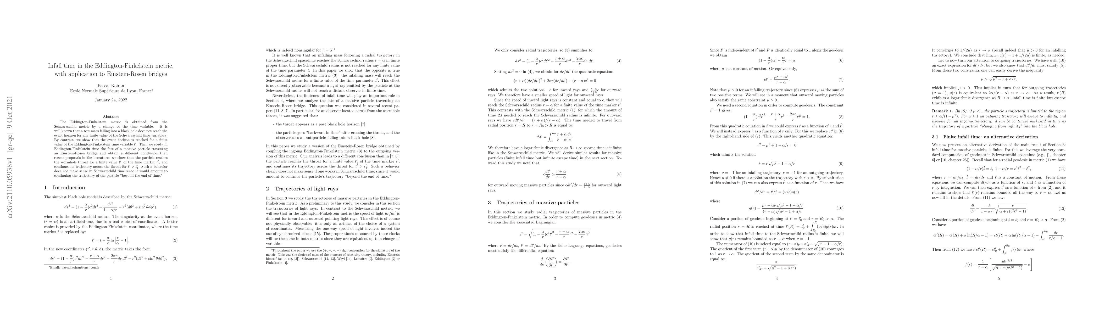 The Eddington-Finkelstein metric is obtained from the Schwarzschild metric by a change of the time variable. It is well known that a test mass falling into a black hole does not reach the event horizon for any finite value of the Schwarzschild time variable $t$. By contrast, we show that the event horizon is reached for a finite value of the Eddington-Finkelstein time variable $t'$. Then we study in Eddington-Finkelstein time the fate of a massive particle traversing an Einstein-Rosen bridge and obtain a different conclusion than recent proposals in the literature: we show that the particle reaches the wormhole throat for a finite value $t'_1$ of the time marker $t'$, and continues its trajectory across the throat for $t'>t'_1$. Such a behavior does not make sense in Schwarzschild time since it would amount to continuing the trajectory of the particle "beyond the end of time."