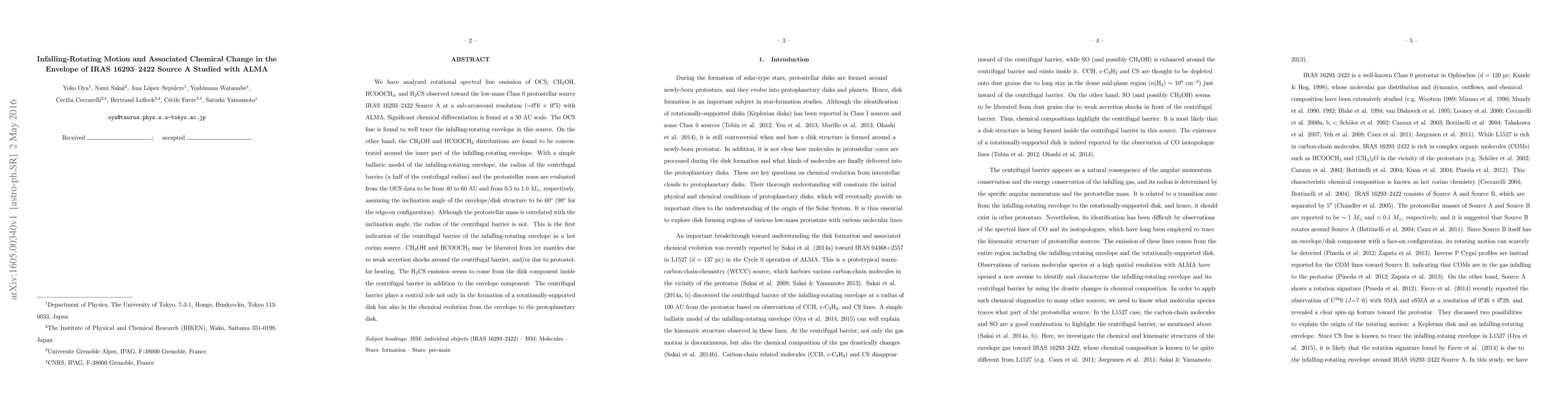 This study using ALMA reveals significant chemical differentiation in the envelope of the low-mass protostellar source IRAS 16293-2422 Source A, identifying OCS as a tracer of the infalling-rotating envelope and CH3OH and HCOOCH3 concentrated near the inner region. The research identifies a centrifugal barrier at 40-60 AU, influencing both disk formation and chemical evolution.