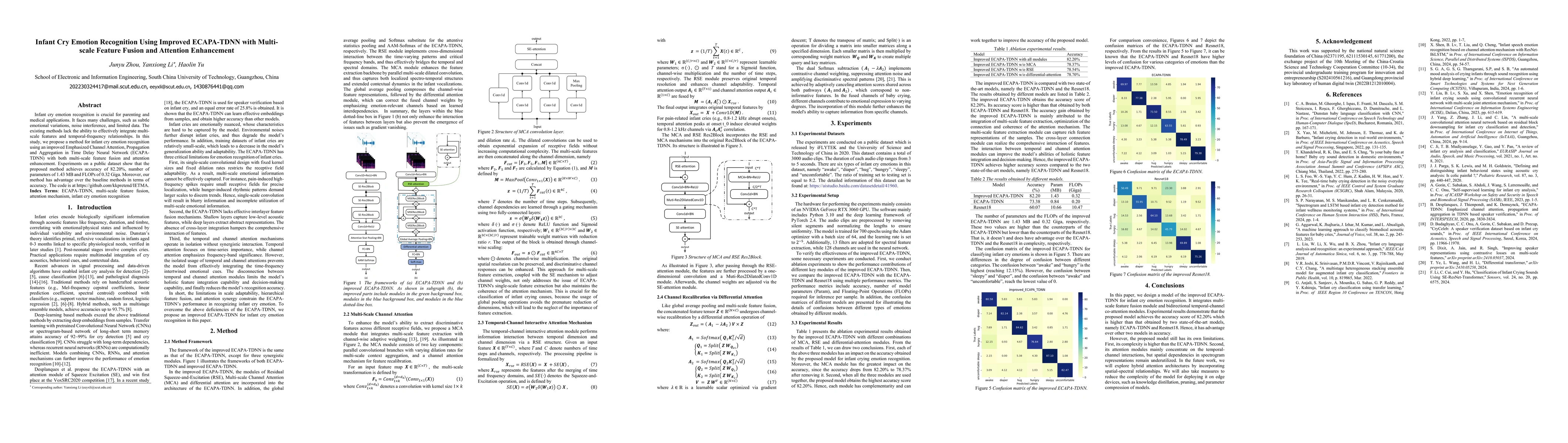 Infant cry emotion recognition is crucial for parenting and medical applications. It faces many challenges, such as subtle emotional variations, noise interference, and limited data. The existing methods lack the ability to effectively integrate multi-scale features and temporal-frequency relationships. In this study, we propose a method for infant cry emotion recognition using an improved Emphasized Channel Attention, Propagation and Aggregation in Time Delay Neural Network (ECAPA-TDNN) with both multi-scale feature fusion and attention enhancement. Experiments on a public dataset show that the proposed method achieves accuracy of 82.20%, number of parameters of 1.43 MB and FLOPs of 0.32 Giga. Moreover, our method has advantage over the baseline methods in terms of accuracy. The code is at https://github.com/kkpretend/IETMA.