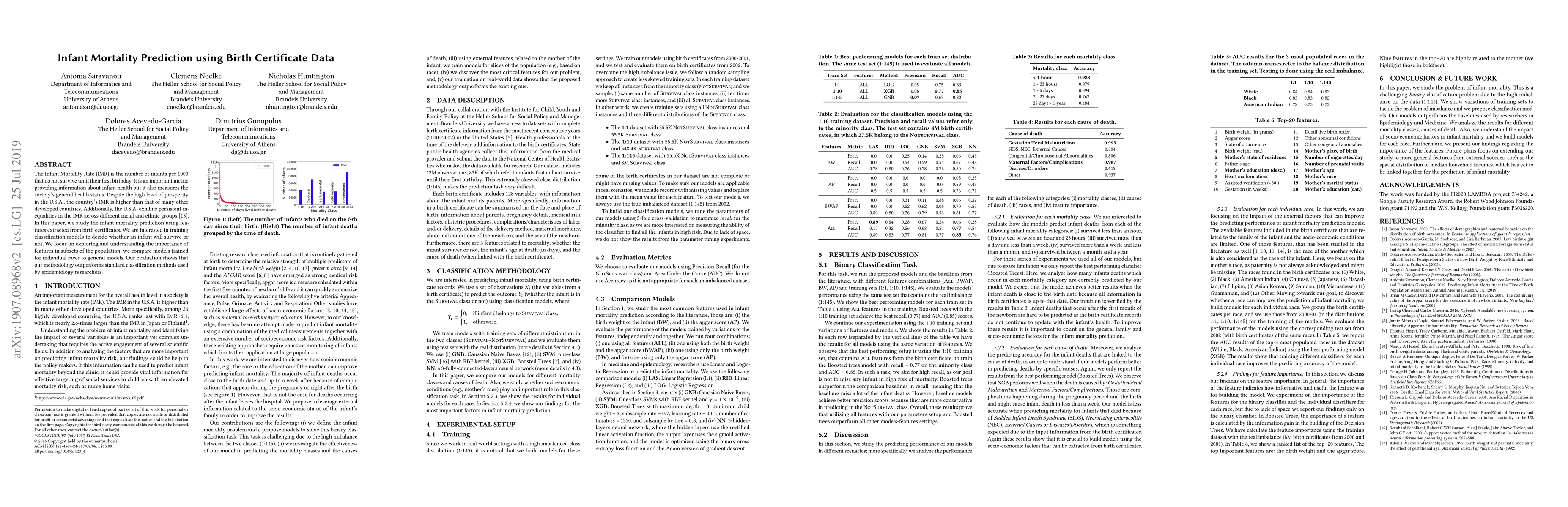 The Infant Mortality Rate (IMR) is the number of infants per 1000 that do not survive until their first birthday. It is an important metric providing information about infant health but it also measures the society's general health status. Despite the high level of prosperity in the U.S.A., the country's IMR is higher than that of many other developed countries. Additionally, the U.S.A. exhibits persistent inequalities in the IMR across different racial and ethnic groups. In this paper, we study the infant mortality prediction using features extracted from birth certificates. We are interested in training classification models to decide whether an infant will survive or not. We focus on exploring and understanding the importance of features in subsets of the population; we compare models trained for individual races to general models. Our evaluation shows that our methodology outperforms standard classification methods used by epidemiology researchers.