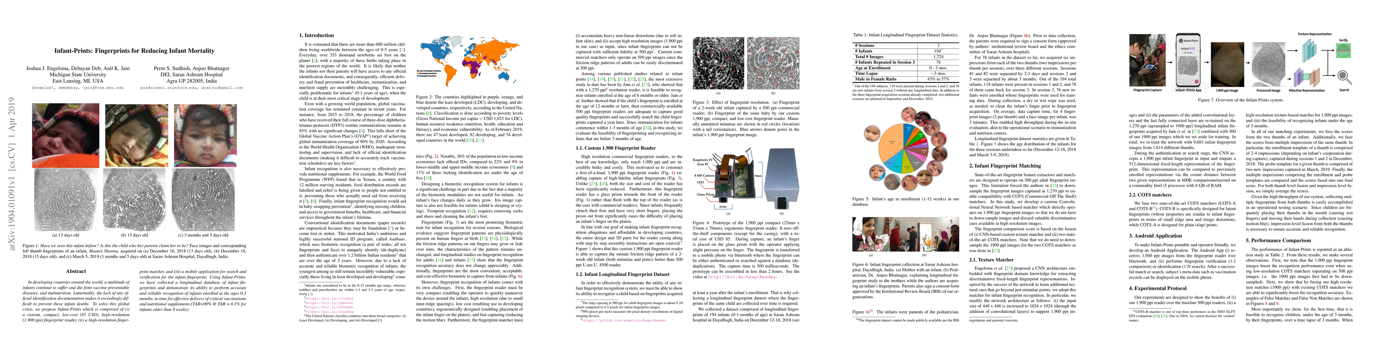 In developing countries around the world, a multitude of infants continue to suffer and die from vaccine-preventable diseases, and malnutrition. Lamentably, the lack of any official identification documentation makes it exceedingly difficult to prevent these infant deaths. To solve this global crisis, we propose Infant-Prints which is comprised of (i) a custom, compact, low-cost (85 USD), high-resolution (1,900 ppi) fingerprint reader, (ii) a high-resolution fingerprint matcher, and (iii) a mobile application for search and verification for the infant fingerprint. Using Infant-Prints, we have collected a longitudinal database of infant fingerprints and demonstrate its ability to perform accurate and reliable recognition of infants enrolled at the ages 0-3 months, in time for effective delivery of critical vaccinations and nutritional supplements (TAR=90% @ FAR = 0.1% for infants older than 8 weeks).