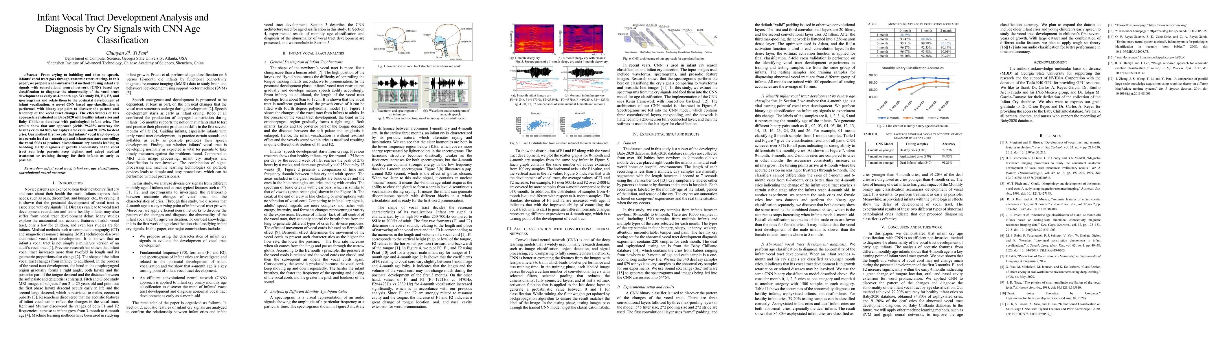 This paper proposes a CNN-based method for diagnosing vocal tract development abnormalities in infants using cry signals as early as 4 months. The study achieves high accuracy in classifying healthy, asphyxiated, and deaf cries, demonstrating the potential for early detection and intervention in infant vocal tract growth.