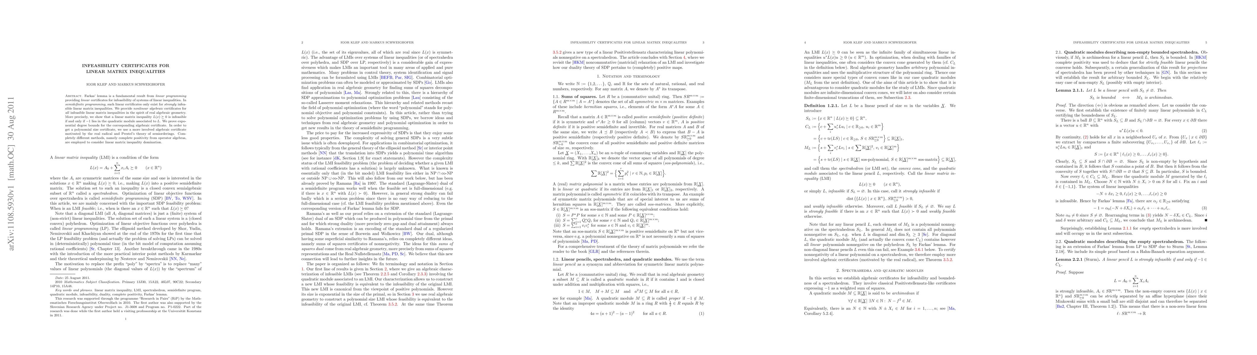 This paper develops nonlinear algebraic certificates for infeasibility of linear matrix inequalities, extending Farkas' lemma from linear programming to semidefinite programming. It provides a quadratic module-based characterization and proves exponential degree bounds, while also introducing a polynomial size certificate using real radical and semiorderings.