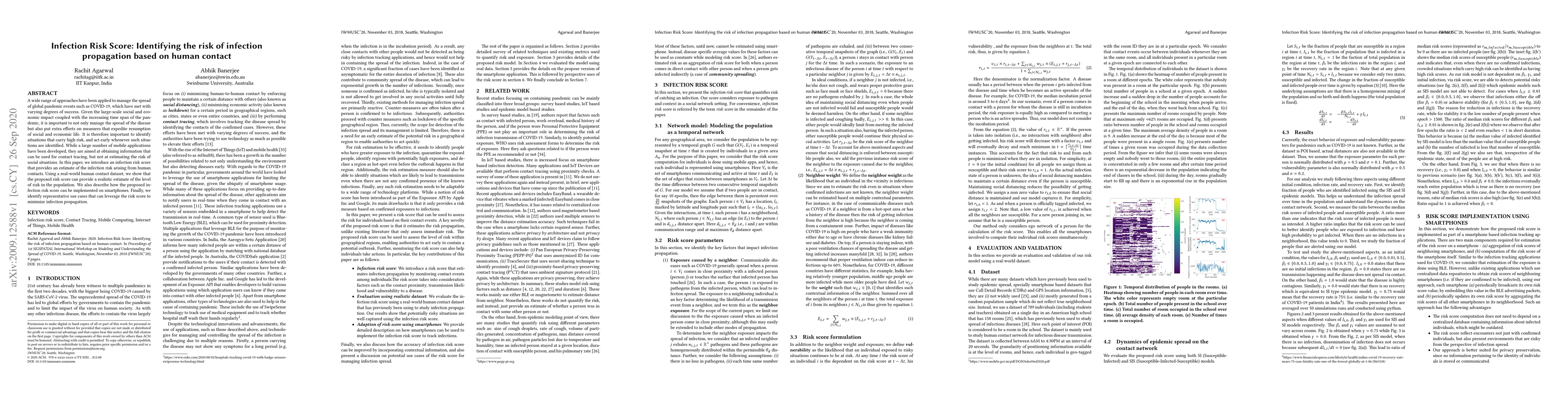 A wide range of approaches have been applied to manage the spread of global pandemic events such as COVID-19, which have met with varying degrees of success. Given the large-scale social and economic impact coupled with the increasing time span of the pandemic, it is important to not only manage the spread of the disease but also put extra efforts on measures that expedite resumption of social and economic life. It is therefore important to identify situations that carry high risk, and act early whenever such situations are identified. While a large number of mobile applications have been developed, they are aimed at obtaining information that can be used for contact tracing, but not at estimating the risk of social situations. In this paper, we introduce an infection risk score that provides an estimate of the infection risk arising from human contacts. Using a real-world human contact dataset, we show that the proposed risk score can provide a realistic estimate of the level of risk in the population. We also describe how the proposed infection risk score can be implemented on smartphones. Finally, we identify representative use cases that can leverage the risk score to minimize infection propagation.