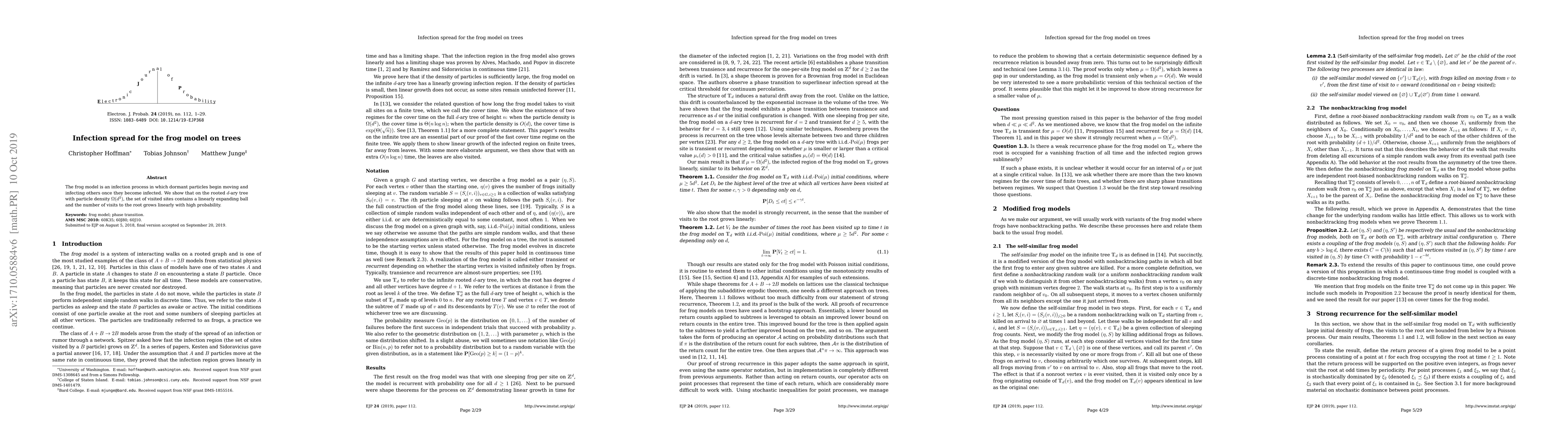 The frog model's infection spread on a rooted d-ary tree shows that visited sites form a linearly expanding ball, and visits to the root grow linearly with high probability.