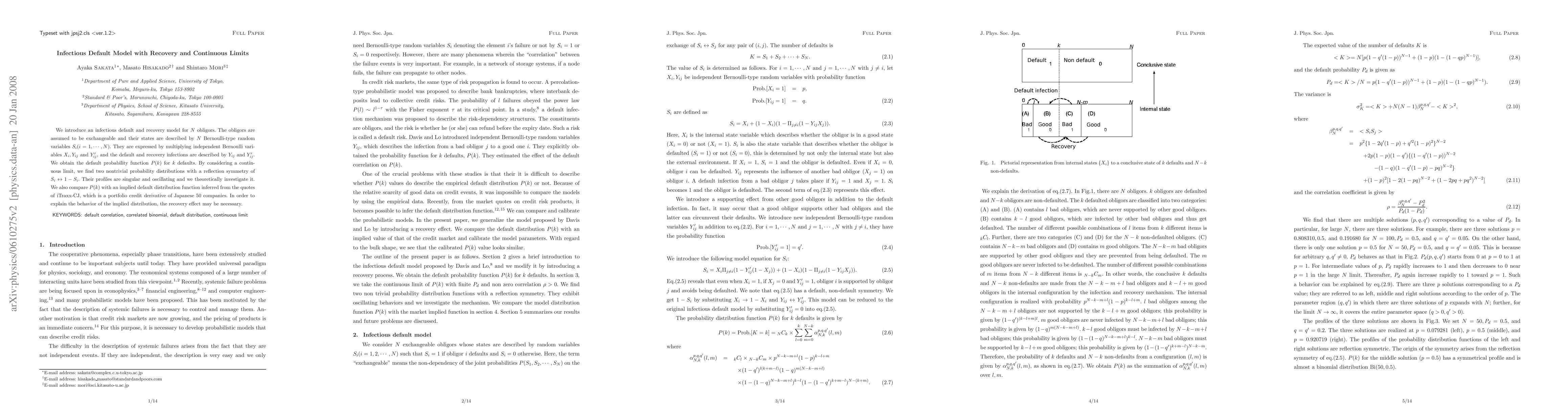 We introduce an infectious default and recovery model for N obligors. Obligors are assumed to be exchangeable and their states are described by N Bernoulli random variables S_{i} (i=1,...,N). They are expressed by multiplying independent Bernoulli variables X_{i},Y_{ij},Y'_{ij}, and default and recovery infections are described by Y_{ij} and Y'_{ij}. We obtain the default probability function P(k) for k defaults. Taking its continuous limit, we find two nontrivial probability distributions with the reflection symmetry of S_{i} \leftrightarrow 1-S_{i}. Their profiles are singular and oscillating and we understand it theoretically. We also compare P(k) with an implied default distribution function inferred from the quotes of iTraxx-CJ. In order to explain the behavior of the implied distribution, the recovery effect may be necessary.
