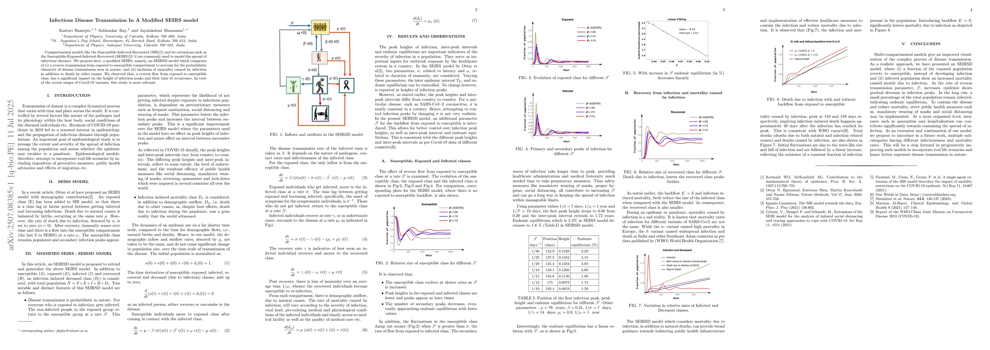 Compartmental models like the Susceptible-Infected-Recovered (SIR)\cite{Kermack1927} and its extensions such as the Susceptible-Exposed-Infected-Recovered (SEIRS)\cite{Ottar2020,Ignazio2021,Grimm2021,Paoluzzi2021} are commonly used to model the spread of infectious diseases. We propose here, a modified SEIRS, namely, an SEIRSD model which comprises of (i) a reverse transmission from exposed to susceptible compartment to account for the probabilistic character of disease transmission seen in nature, and (ii) inclusion of mortality caused by infection in addition to death by other causes. We observed that, a reverse flow from exposed to susceptible class, has a significant impact on the height of infection peaks and their time of occurrence. In view of the recent surges of Covid-19 variants, this study is most relevant.