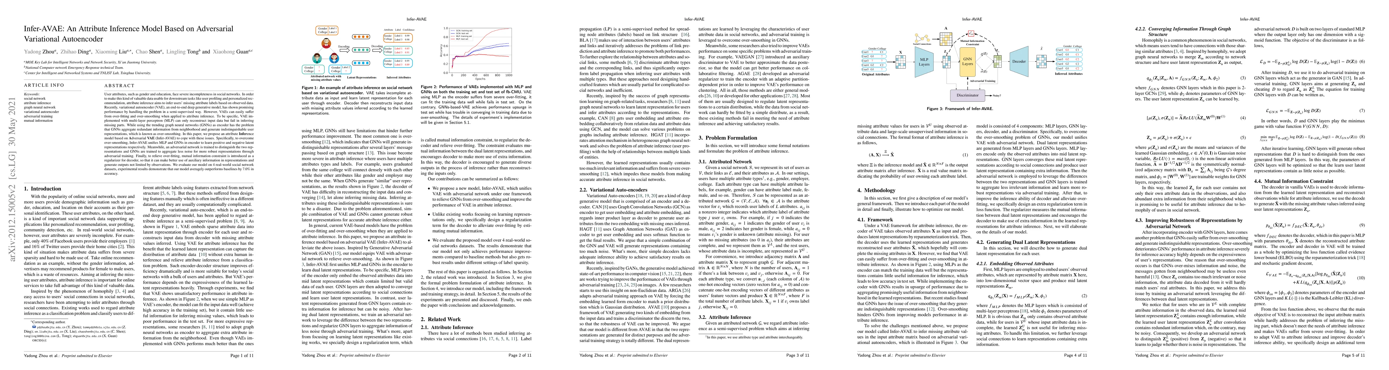 The paper proposes Infer-AVAE, an attribute inference model combining adversarial variational autoencoders and graph neural networks to address over-fitting and over-smoothing issues in inferring missing user attributes. The model integrates MLP and GNNs in the encoder and uses adversarial training to generate robust representations, achieving a 7.0% improvement in accuracy over baselines on real-world datasets.
