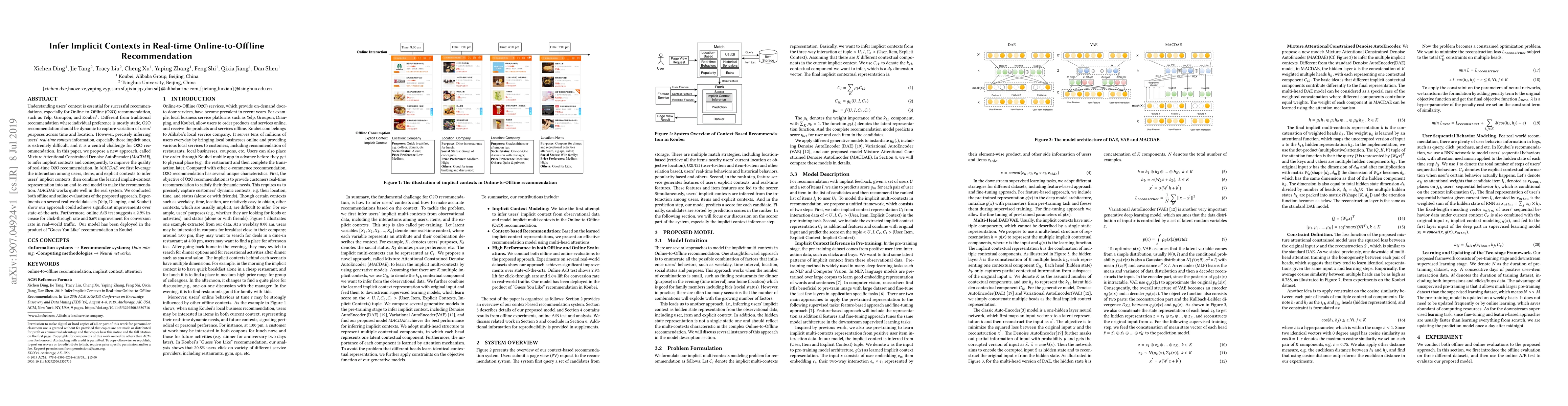 This paper proposes a Mixture Attentional Constrained Denoise AutoEncoder (MACDAE) to infer implicit contexts for real-time Online-to-Offline (O2O) recommendations, significantly improving recommendation quality. The model leverages interactions among users, items, and explicit contexts to learn implicit contexts, which are then integrated into an end-to-end recommendation system, achieving notable improvements over state-of-the-art methods in real-world datasets and traffic.