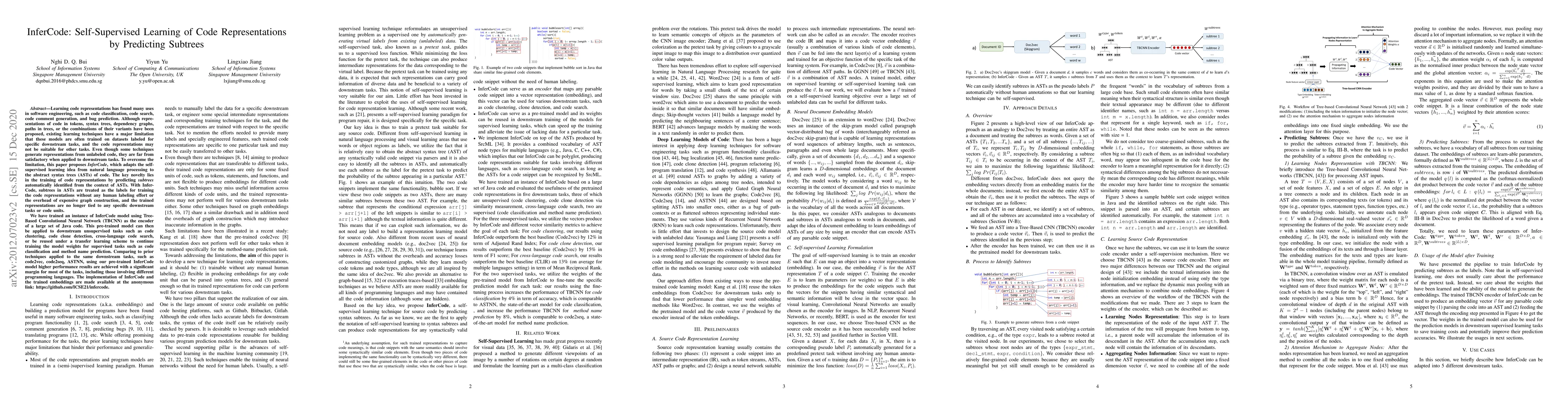 Building deep learning models on source code has found many successful software engineering applications, such as code search, code comment generation, bug detection, code migration, and so on. Current learning techniques, however, have a major drawback that these models are mostly trained on datasets labeled for particular downstream tasks, and code representations may not be suitable for other tasks. While some techniques produce representations from unlabeled code, they are far from satisfactory when applied to downstream tasks. Although certain techniques generate representations from unlabeled code when applied to downstream tasks they are far from satisfactory. This paper proposes InferCode to overcome the limitation by adapting the self-supervised learning mechanism to build source code model. The key novelty lies in training code representations by predicting automatically identified subtrees from the context of the ASTs. Subtrees in ASTs are treated with InferCode as the labels for training code representations without any human labeling effort or the overhead of expensive graph construction, and the trained representations are no longer tied to any specific downstream tasks or code units. We trained an InferCode model instance using the Tree-based CNN as the encoder of a large set of Java code and applied it to downstream unsupervised tasks such as code clustering, code clone detection, cross-language code search or reused under a transfer learning scheme to continue training the model weights for supervised tasks such as code classification and method name prediction. Compared to previous code learning techniques applied to the same downstream tasks, such as Code2Vec, Code2Seq, ASTNN, higher performance results are achieved using our pre-trained InferCode model with a significant margin for most tasks including those involving different programming languages.