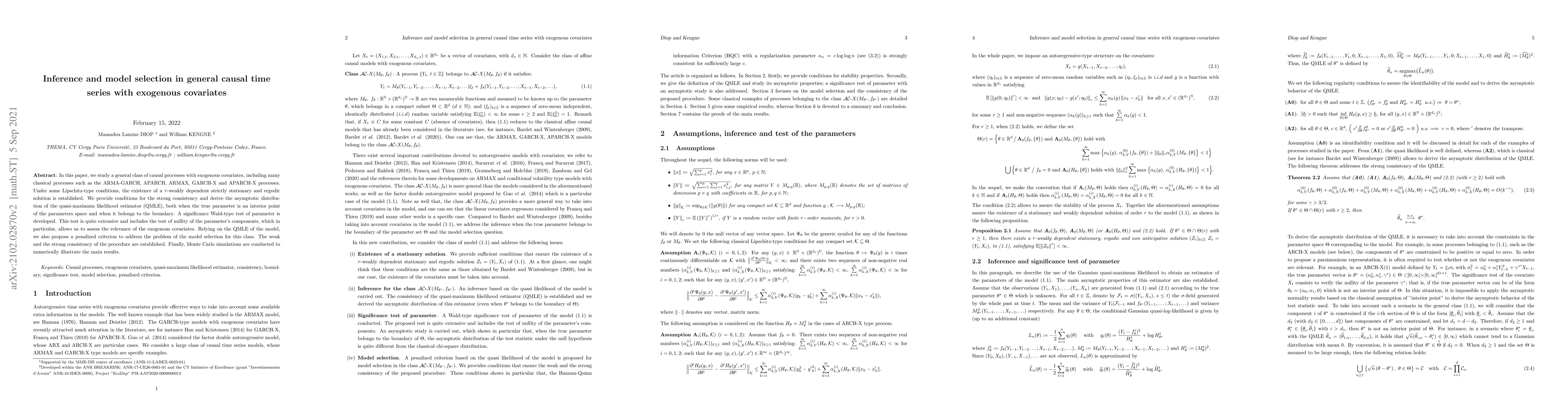 This paper investigates causal time series models with exogenous covariates, establishing conditions for the existence of solutions and the consistency of the quasi-maximum likelihood estimator. It develops a Wald-type test to assess the relevance of covariates and proposes a penalized criterion for model selection, validated through Monte Carlo simulations.