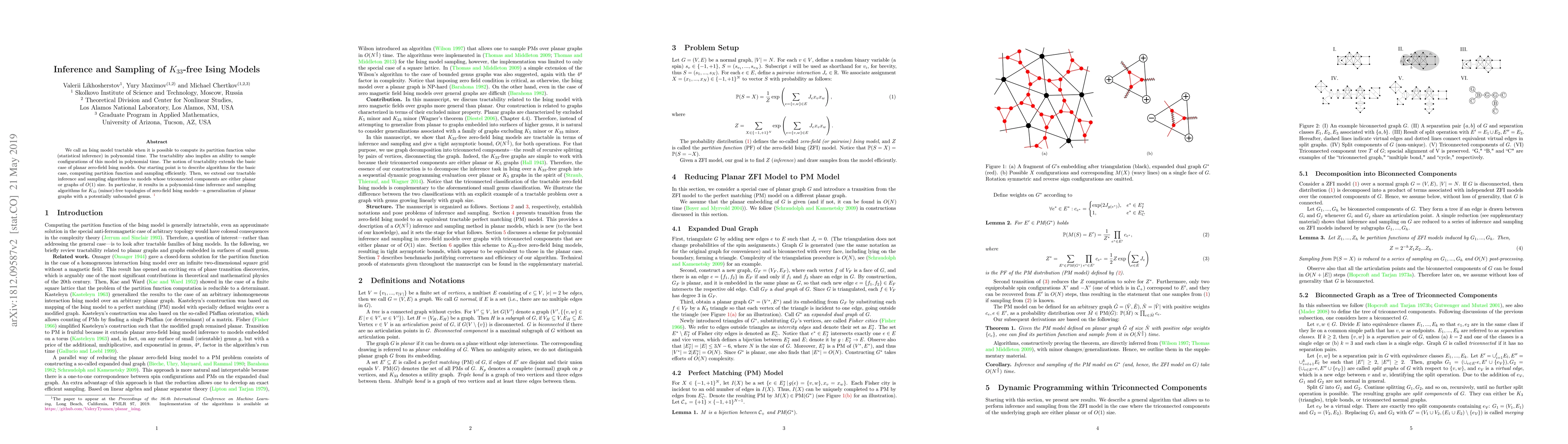 We call an Ising model tractable when it is possible to compute its partition function value (statistical inference) in polynomial time. The tractability also implies an ability to sample configurations of this model in polynomial time. The notion of tractability extends the basic case of planar zero-field Ising models. Our starting point is to describe algorithms for the basic case computing partition function and sampling efficiently. To derive the algorithms, we use an equivalent linear transition to perfect matching counting and sampling on an expanded dual graph. Then, we extend our tractable inference and sampling algorithms to models, whose triconnected components are either planar or graphs of $O(1)$ size. In particular, it results in a polynomial-time inference and sampling algorithms for $K_{33}$ (minor) free topologies of zero-field Ising models - a generalization of planar graphs with a potentially unbounded genus.