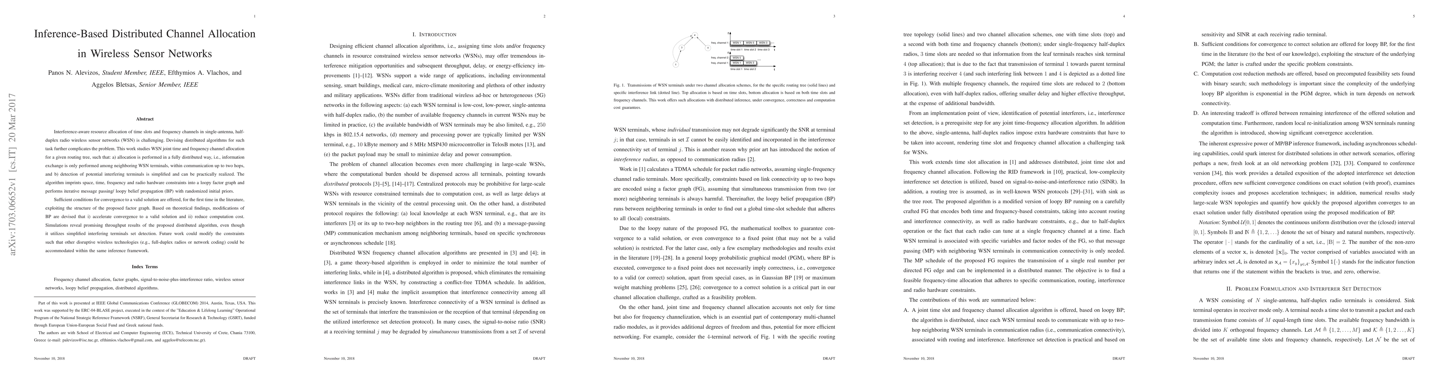 Interference-aware resource allocation of time slots and frequency channels in single-antenna, halfduplex radio wireless sensor networks (WSN) is challenging. Devising distributed algorithms for such task further complicates the problem. This work studiesWSN joint time and frequency channel allocation for a given routing tree, such that: a) allocation is performed in a fully distributed way, i.e., information exchange is only performed among neighboring WSN terminals, within communication up to two hops, and b) detection of potential interfering terminals is simplified and can be practically realized. The algorithm imprints space, time, frequency and radio hardware constraints into a loopy factor graph and performs iterative message passing/ loopy belief propagation (BP) with randomized initial priors. Sufficient conditions for convergence to a valid solution are offered, for the first time in the literature, exploiting the structure of the proposed factor graph. Based on theoretical findings, modifications of BP are devised that i) accelerate convergence to a valid solution and ii) reduce computation cost. Simulations reveal promising throughput results of the proposed distributed algorithm, even though it utilizes simplified interfering terminals set detection. Future work could modify the constraints such that other disruptive wireless technologies (e.g., full-duplex radios or network coding) could be accommodated within the same inference framework.