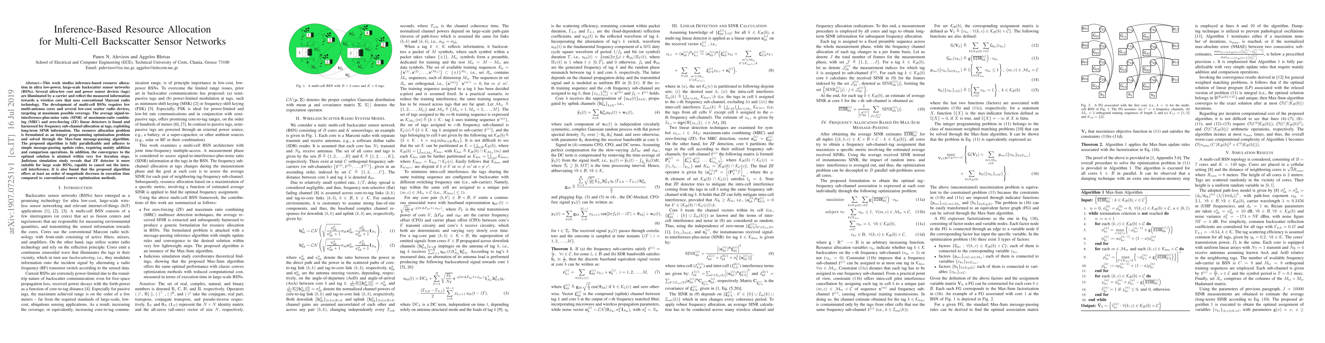 This paper proposes an inference-based resource allocation algorithm for multi-cell backscatter sensor networks, optimizing frequency sub-channel allocation using SINR information and solving the problem via an efficient Max-Sum message-passing algorithm. Simulation results show that the zero-forcing detector is optimal for large-scale networks and the algorithm significantly reduces execution time compared to conventional methods.