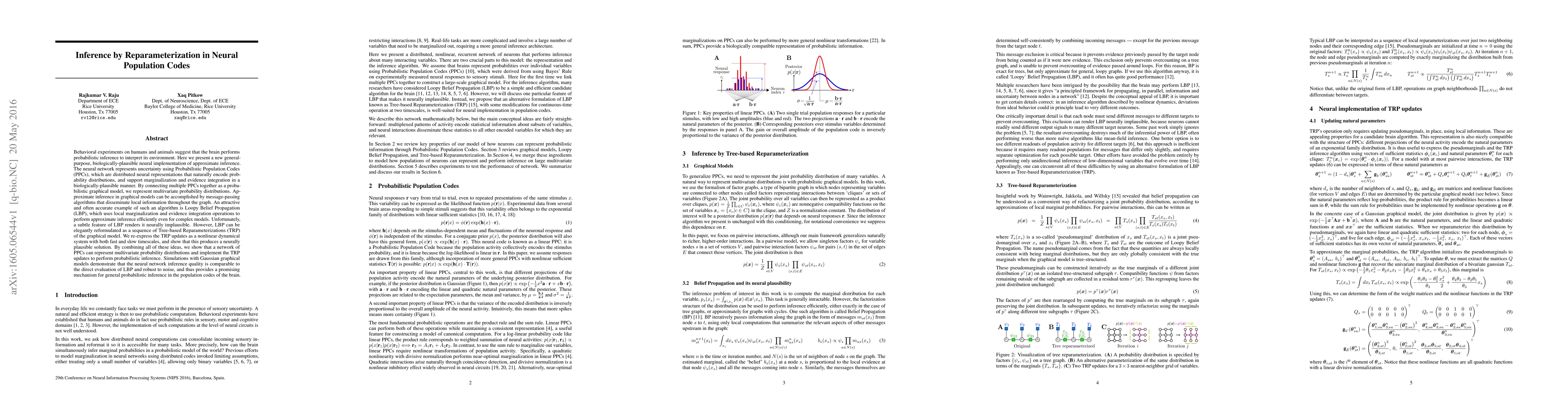 This paper proposes a biologically plausible neural network model using Probabilistic Population Codes (PPCs) to perform approximate probabilistic inference through Tree-based Reparameterizations (TRP) updates, demonstrating comparable inference quality to Loopy Belief Propagation (LBP) and robustness against noise.