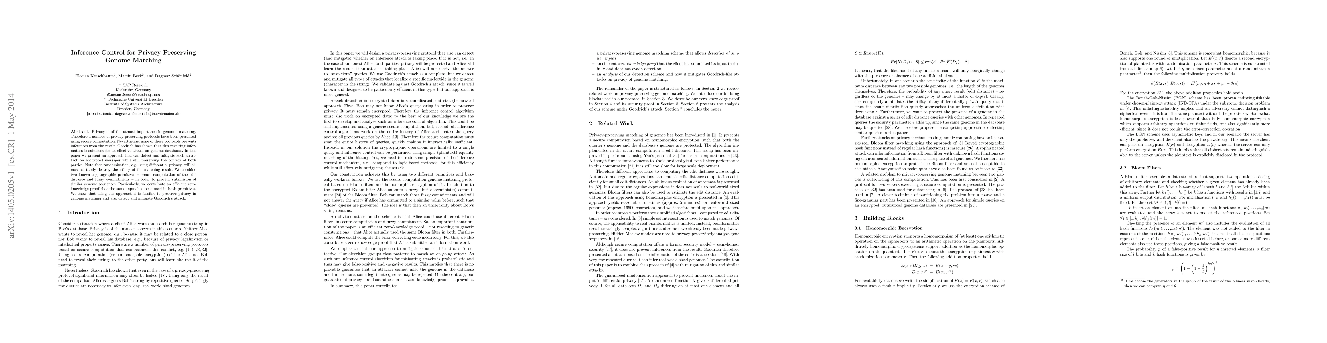 Privacy is of the utmost importance in genomic matching. Therefore a number of privacy-preserving protocols have been presented using secure computation. Nevertheless, none of these protocols prevents inferences from the result. Goodrich has shown that this resulting information is sufficient for an effective attack on genome databases. In this paper we present an approach that can detect and mitigate such an attack on encrypted messages while still preserving the privacy of both parties. Note that randomization, e.g.~using differential privacy, will almost certainly destroy the utility of the matching result. We combine two known cryptographic primitives -- secure computation of the edit distance and fuzzy commitments -- in order to prevent submission of similar genome sequences. Particularly, we contribute an efficient zero-knowledge proof that the same input has been used in both primitives. We show that using our approach it is feasible to preserve privacy in genome matching and also detect and mitigate Goodrich's attack.