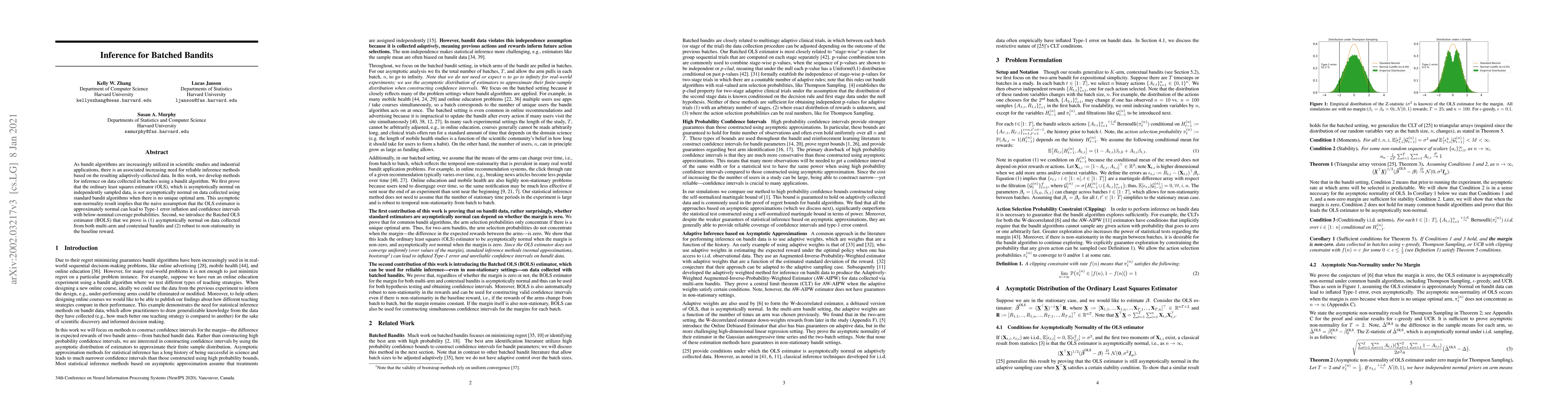 The paper develops methods for inference on data collected in batches using bandit algorithms, proving that the ordinary least squares estimator (OLS) is not asymptotically normal on such data when there is no unique optimal arm.