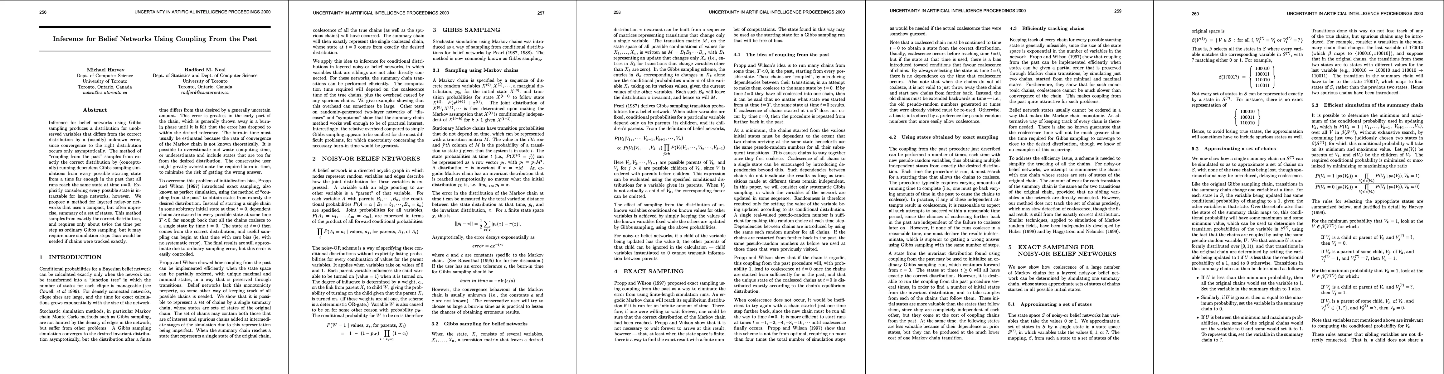 This paper proposes a method for inference in belief networks using "coupling from the past," which samples exactly the correct distribution by simulating dependent Gibbs sampling from all possible starting states. For large networks, a compact summary of states is used, which is efficient but may require more simulation steps compared to exact tracking.