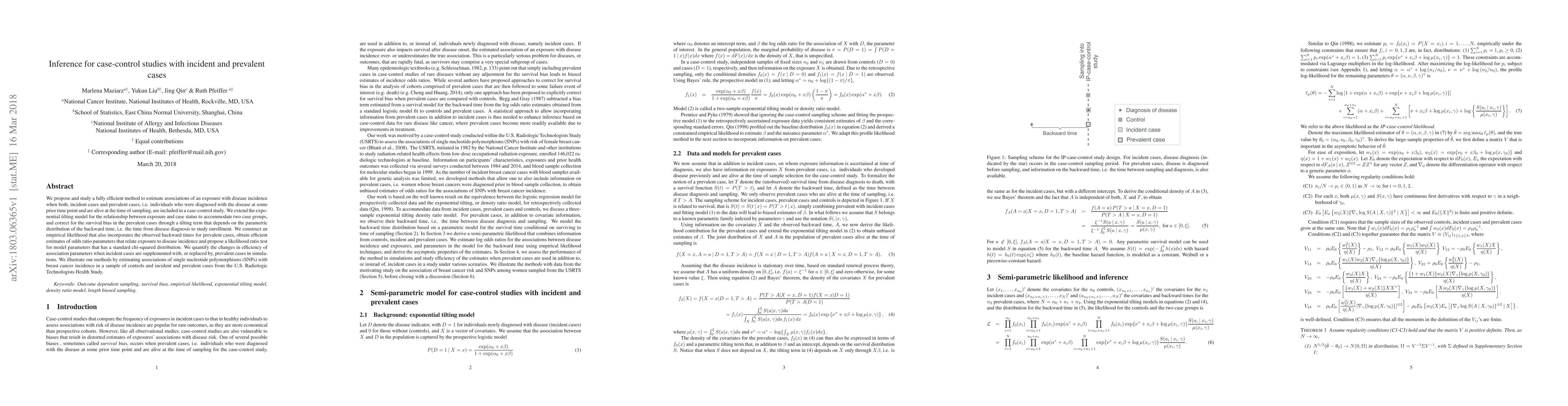 This paper proposes a method to estimate exposure-disease incidence associations in case-control studies that include both incident and prevalent cases, correcting for survival bias and constructing efficient empirical likelihood estimates. The method is demonstrated through SNP-breast cancer incidence analysis in the U.S. Radiologic Technologists Health Study.