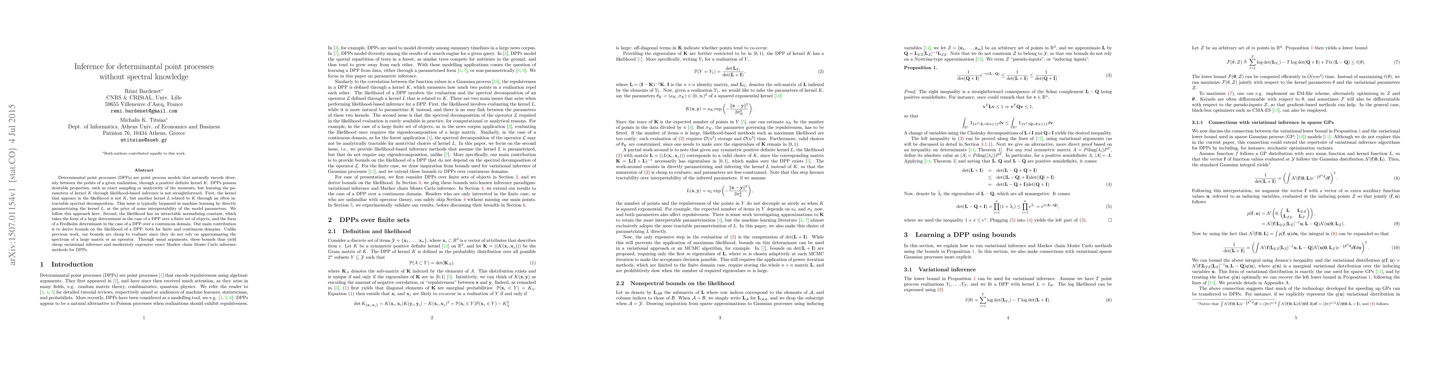 This paper proposes efficient inference methods for determinantal point processes (DPPs) by deriving bounds on their likelihood that do not require spectral decomposition, thus avoiding the need for intractable matrix or operator approximations. These bounds enable cost-effective variational inference and moderately expensive exact MCMC methods for DPPs.
