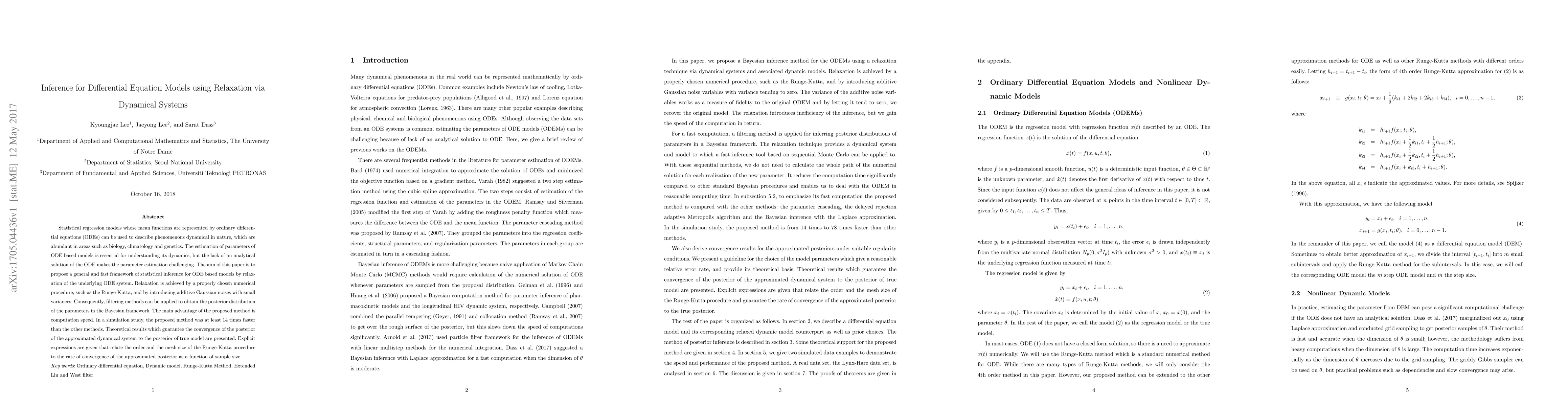 Statistical regression models whose mean functions are represented by ordinary differential equations (ODEs) can be used to describe phenomenons dynamical in nature, which are abundant in areas such as biology, climatology and genetics. The estimation of parameters of ODE based models is essential for understanding its dynamics, but the lack of an analytical solution of the ODE makes the parameter estimation challenging. The aim of this paper is to propose a general and fast framework of statistical inference for ODE based models by relaxation of the underlying ODE system. Relaxation is achieved by a properly chosen numerical procedure, such as the Runge-Kutta, and by introducing additive Gaussian noises with small variances. Consequently, filtering methods can be applied to obtain the posterior distribution of the parameters in the Bayesian framework. The main advantage of the proposed method is computation speed. In a simulation study, the proposed method was at least 14 times faster than the other methods. Theoretical results which guarantee the convergence of the posterior of the approximated dynamical system to the posterior of true model are presented. Explicit expressions are given that relate the order and the mesh size of the Runge-Kutta procedure to the rate of convergence of the approximated posterior as a function of sample size.