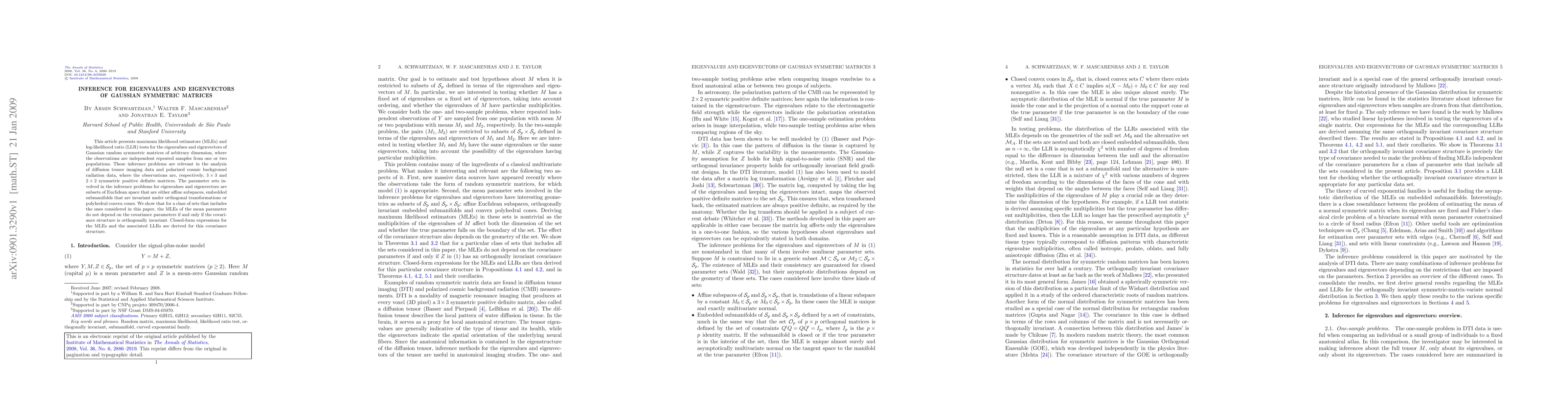 This paper develops maximum likelihood estimators and log-likelihood ratio tests for eigenvalues and eigenvectors of Gaussian symmetric matrices, relevant for analyzing diffusion tensor imaging and polarized cosmic background radiation data. It shows that MLEs for mean parameters are independent of covariance parameters when the covariance structure is orthogonally invariant, providing closed-form expressions for such cases.