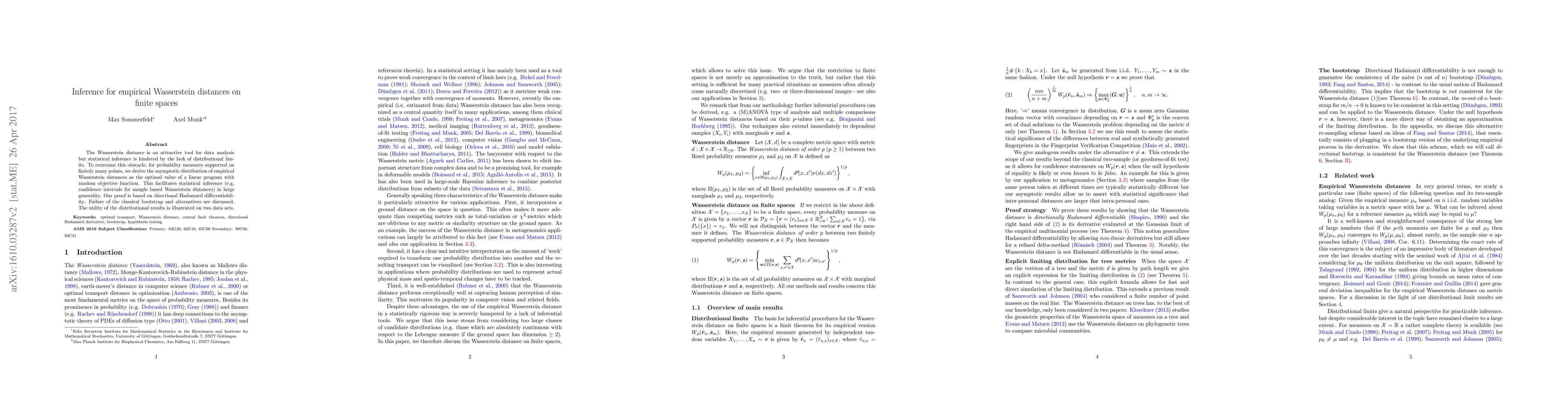 This paper derives the asymptotic distribution of empirical Wasserstein distances for finitely supported probability measures, facilitating statistical inference through the optimal solution of a linear program. It discusses the failure of the classical bootstrap and illustrates the utility of the results with two datasets.