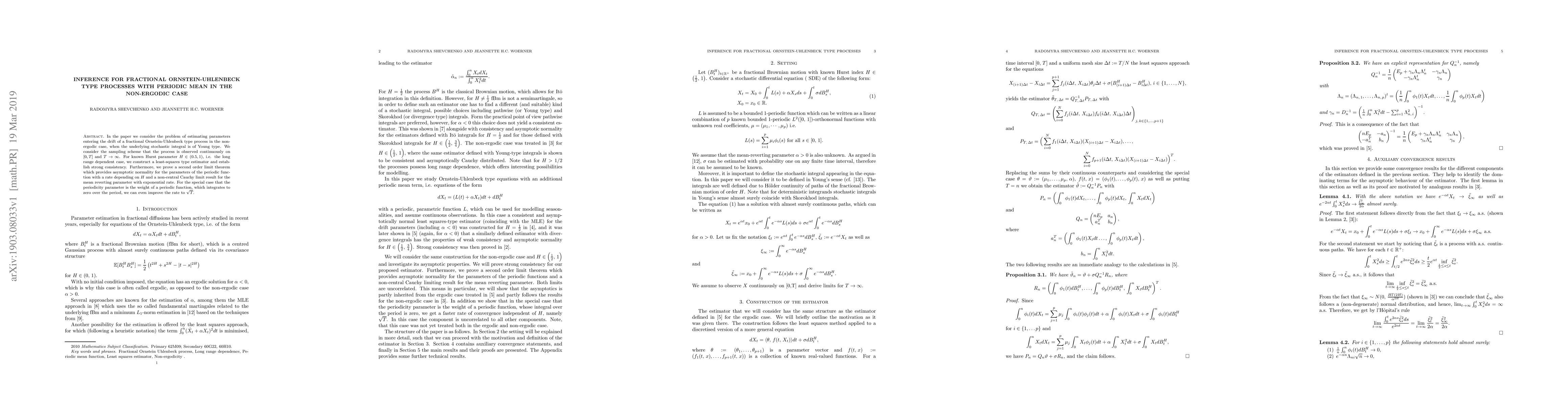 In the paper we consider the problem of estimating parameters entering the drift of a fractional Ornstein-Uhlenbeck type process in the non-ergodic case, when the underlying stochastic integral is of Young type. We consider the sampling scheme that the process is observed continuously on $[0,T]$ and $T\to\infty$. For known Hurst parameter $H\in(0.5, 1)$, i.e. the long range dependent case, we construct a least-squares type estimator and establish strong consistency. Furthermore, we prove a second order limit theorem which provides asymptotic normality for the parameters of the periodic function with a rate depending on $H$ and a non-central Cauchy limit result for the mean reverting parameter with exponential rate. For the special case that the periodicity parameter is the weight of a periodic function, which integrates to zero over the period, we can even improve the rate to $\sqrt{T}$.