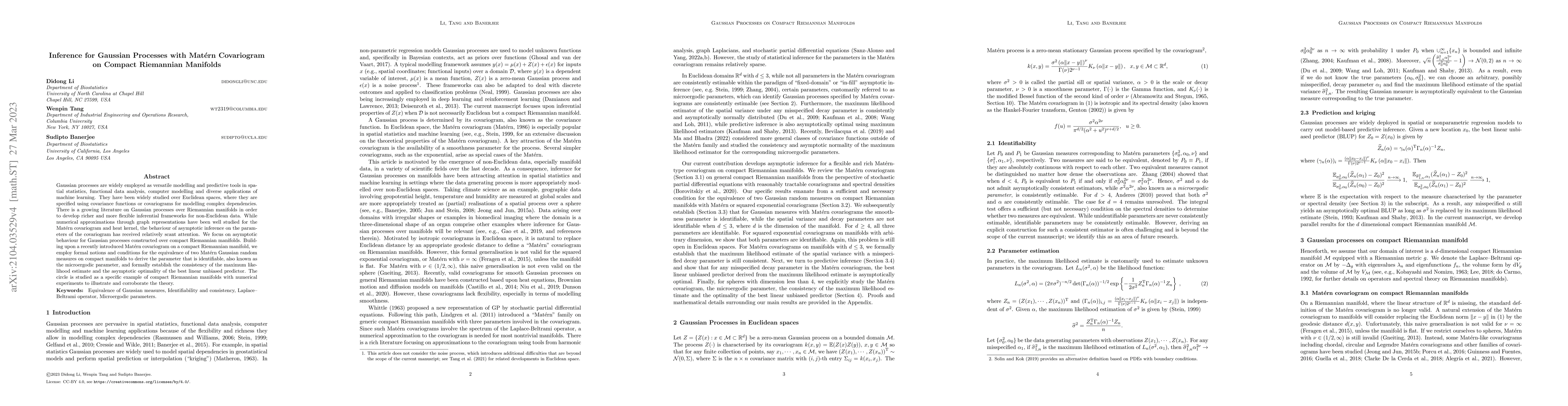 This paper investigates the asymptotic inference of Gaussian processes with Matérn covariograms on compact Riemannian manifolds, focusing on the identifiability of parameters and the consistency of maximum likelihood estimates. It establishes the asymptotic optimality of the best linear unbiased predictor and uses numerical experiments on the circle to validate the theoretical results.