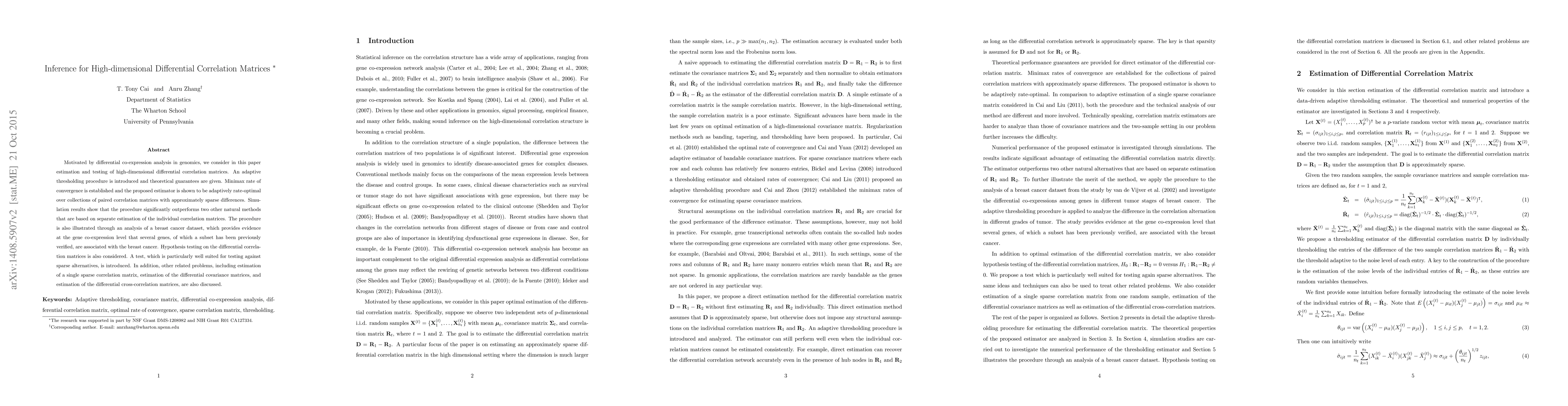 This paper proposes an adaptive thresholding method for estimating and testing high-dimensional differential correlation matrices, achieving minimax rate of convergence and outperforming alternative methods in simulations. The method is demonstrated on a breast cancer dataset, highlighting its effectiveness in identifying gene co-expression associations.