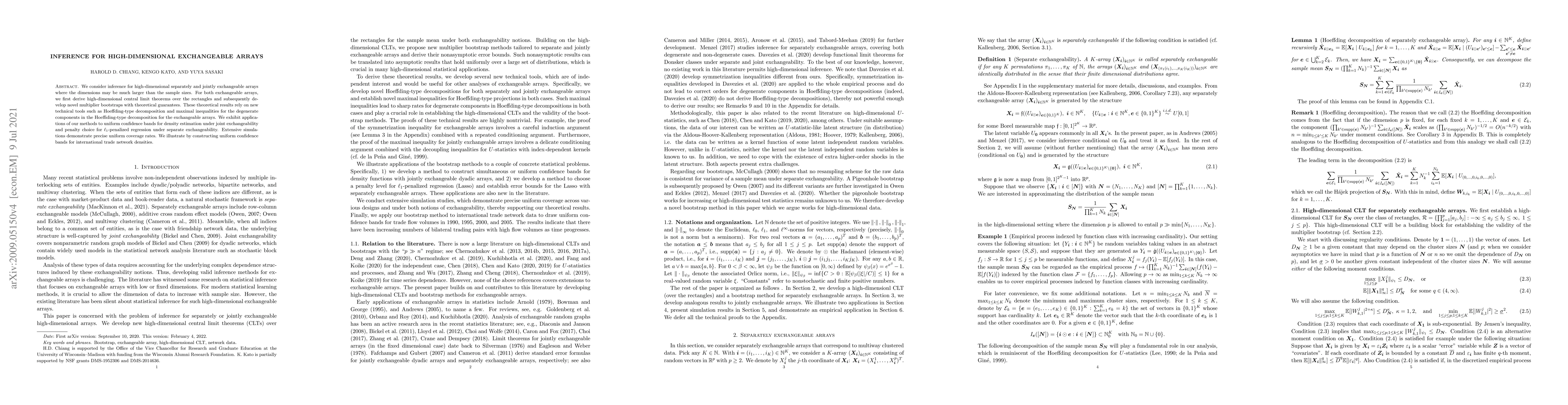This paper develops inference methods for high-dimensional exchangeable arrays, deriving central limit theorems and novel multiplier bootstraps with theoretical guarantees. Applications include uniform confidence bands for density estimation and $\ell_1$-penalized regression, supported by simulations showing accurate coverage rates.