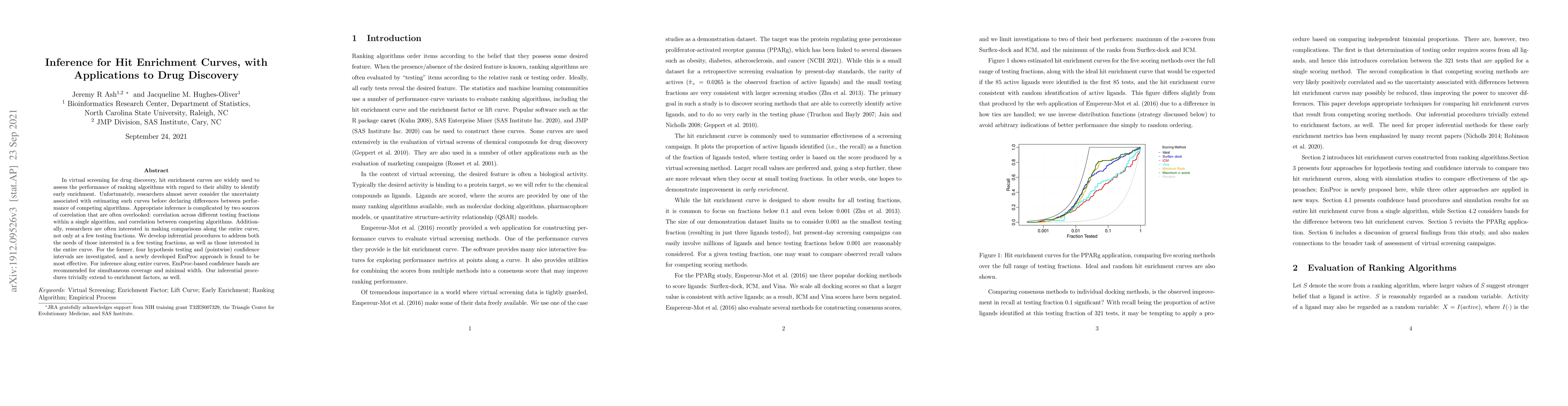 In virtual screening for drug discovery, hit enrichment curves are widely used to assess the performance of ranking algorithms with regard to their ability to identify early enrichment. Unfortunately, researchers almost never consider the uncertainty associated with estimating such curves before declaring differences between performance of competing algorithms. Appropriate inference is complicated by two sources of correlation that are often overlooked: correlation across different testing fractions within a single algorithm, and correlation between competing algorithms. Additionally, researchers are often interested in making comparisons along the entire curve, not only at a few testing fractions. We develop inferential procedures to address both the needs of those interested in a few testing fractions, as well as those interested in the entire curve. For the former, four hypothesis testing and (pointwise) confidence intervals are investigated, and a newly developed EmProc approach is found to be most effective. For inference along entire curves, EmProc-based confidence bands are recommended for simultaneous coverage and minimal width. Our inferential procedures trivially extend to enrichment factors, as well.