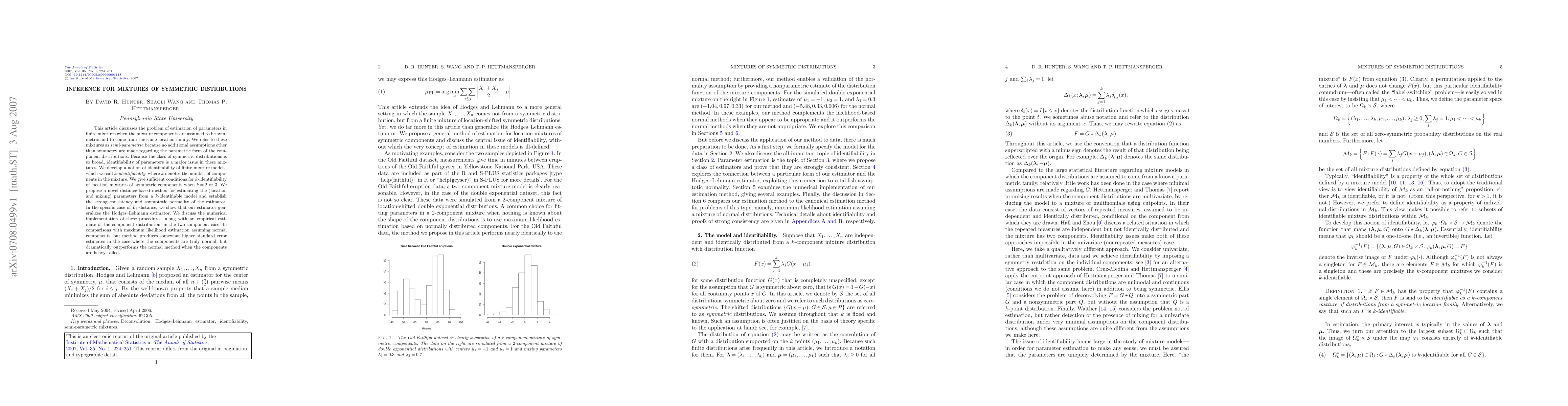 The paper develops a novel distance-based method for estimating parameters in finite mixtures of symmetric distributions, focusing on k-identifiability for k=2 or 3 components.