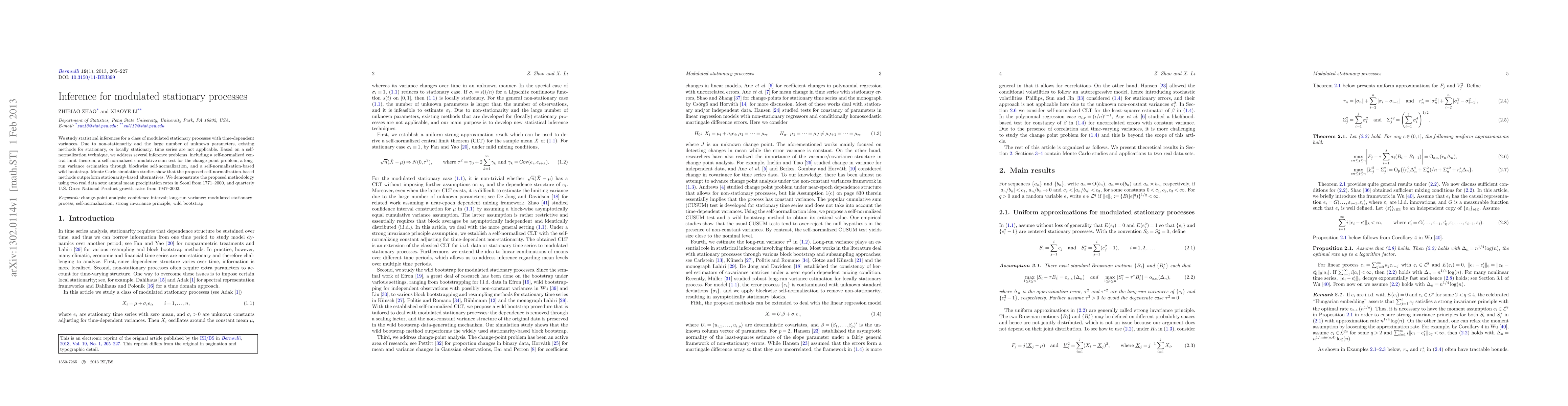 We study statistical inferences for a class of modulated stationary processes with time-dependent variances. Due to non-stationarity and the large number of unknown parameters, existing methods for stationary, or locally stationary, time series are not applicable. Based on a self-normalization technique, we address several inference problems, including a self-normalized central limit theorem, a self-normalized cumulative sum test for the change-point problem, a long-run variance estimation through blockwise self-normalization, and a self-normalization-based wild bootstrap. Monte Carlo simulation studies show that the proposed self-normalization-based methods outperform stationarity-based alternatives. We demonstrate the proposed methodology using two real data sets: annual mean precipitation rates in Seoul from 1771-2000, and quarterly U.S. Gross National Product growth rates from 1947-2002.