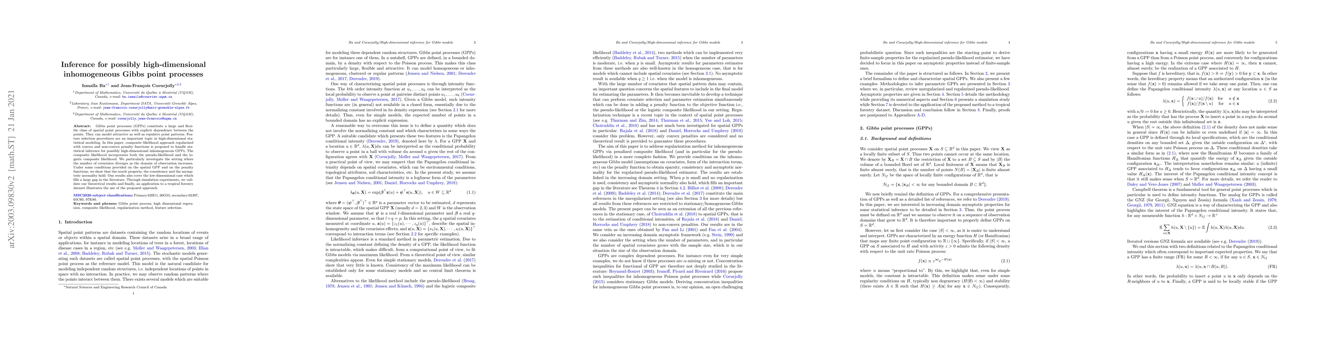 This paper proposes a composite likelihood approach with regularization for statistical inference in high-dimensional inhomogeneous Gibbs point processes, demonstrating oracle properties, consistency, and asymptotic normality under certain conditions. The method is validated through simulations and applied to a tropical forestry dataset.