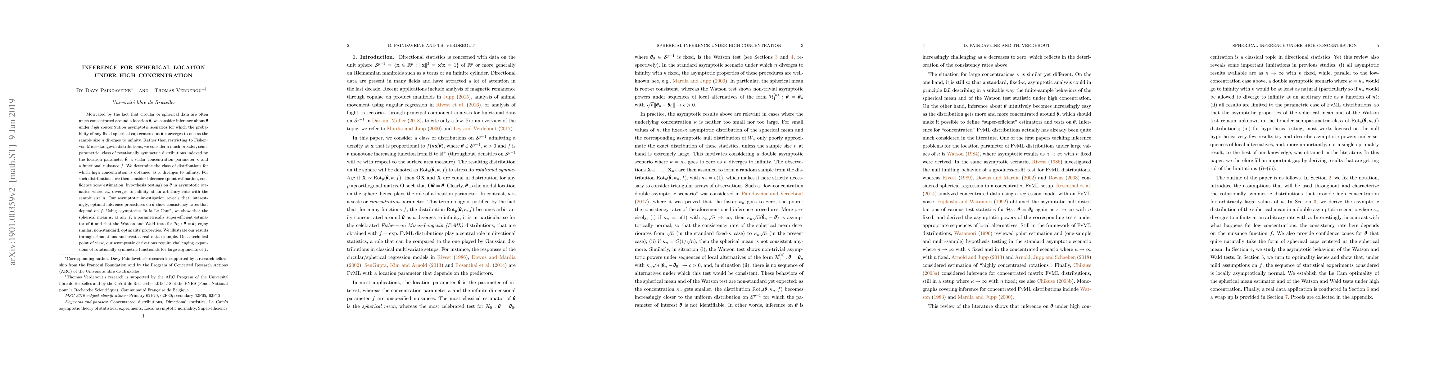 This research paper investigates how to make accurate inferences about the location of a spherical data set as it becomes increasingly concentrated around a point, without requiring specific assumptions about the underlying distribution. It finds that certain estimators and tests remain optimal even under high concentration scenarios, with key performance rates depending on additional parameters of the model.