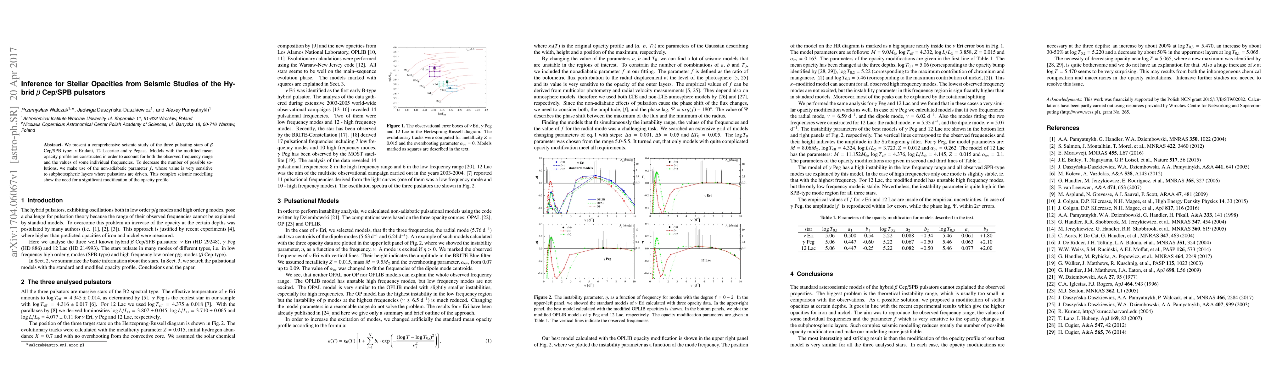 We present a comprehensive seismic study of the three pulsating stars of $\beta$ Cep/SPB type: $\nu$ Eridani, 12 Lacertae and $\gamma$ Pegasi. Models with the modified mean opacity profile are constructed in order to account for both the observed frequency range and the values of some individual frequencies. To decrease the number of possible solutions, we make use of the non-adiabatic parameter $f$, whose value is very sensitive to subphotospheric layers where pulsations are driven. This complex seismic modelling show the need for a significant modification of the opacity profile.