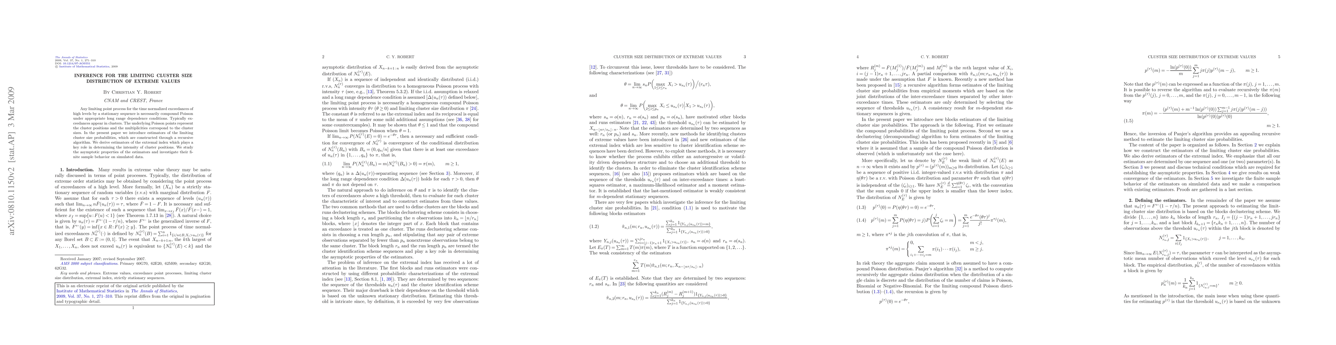 This paper introduces estimators for the limiting cluster size distribution in extreme value theory, showing that under long-range dependence, exceedances form compound Poisson clusters. It develops recursive algorithms for these estimators and examines their asymptotic properties and finite sample performance through simulations.