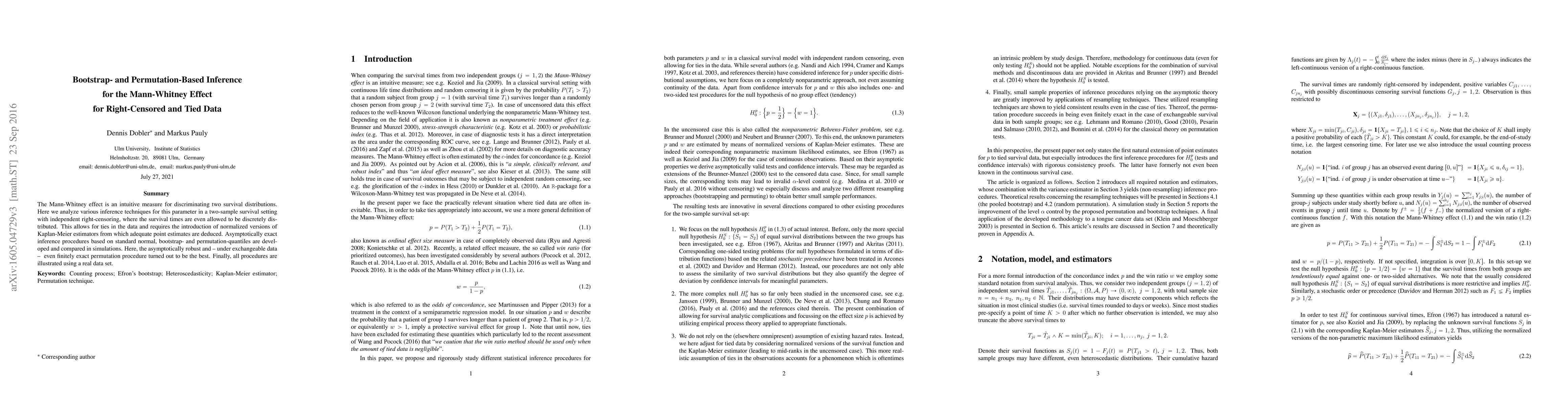The Mann-Whitney effect is an intuitive measure for discriminating two survival distributions. Here we analyze various inference techniques for this parameter in a two-sample survival setting with independent right-censoring, where the survival times are even allowed to be discretely distributed. This allows for ties in the data and requires the introduction of normalized versions of Kaplan-Meier estimators from which adequate point estimates are deduced. From an asymptotic analysis of the latter, asymptotically exact inference procedures based on standard normal, bootstrap- and permutation-quantiles are developed and compared in simulations. Here, the asymptotically robust and, in case of equal survival and censoring distributions, even finitely exact permutation procedure turned out to be the best. Finally, all procedures are illustrated using a real data set.