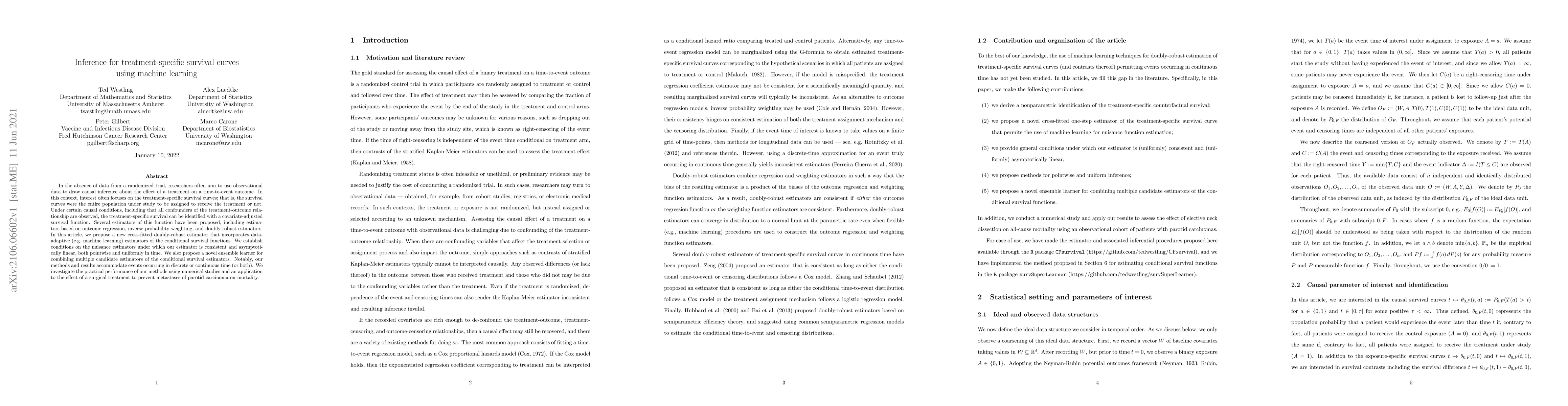This paper proposes a new cross-fitted doubly-robust estimator for inferring treatment-specific survival curves using machine learning techniques, ensuring consistency and asymptotic linearity under certain conditions. It also introduces an ensemble learner for combining multiple conditional survival estimators and demonstrates its practical performance through numerical studies and an application to surgical treatment outcomes.