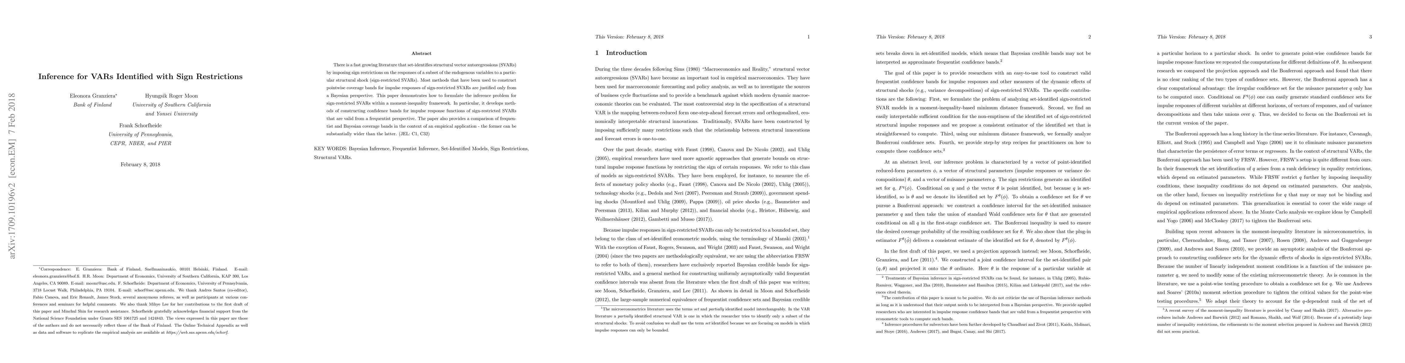 There is a fast growing literature that set-identifies structural vector autoregressions (SVARs) by imposing sign restrictions on the responses of a subset of the endogenous variables to a particular structural shock (sign-restricted SVARs). Most methods that have been used to construct pointwise coverage bands for impulse responses of sign-restricted SVARs are justified only from a Bayesian perspective. This paper demonstrates how to formulate the inference problem for sign-restricted SVARs within a moment-inequality framework. In particular, it develops methods of constructing confidence bands for impulse response functions of sign-restricted SVARs that are valid from a frequentist perspective. The paper also provides a comparison of frequentist and Bayesian coverage bands in the context of an empirical application - the former can be substantially wider than the latter.
